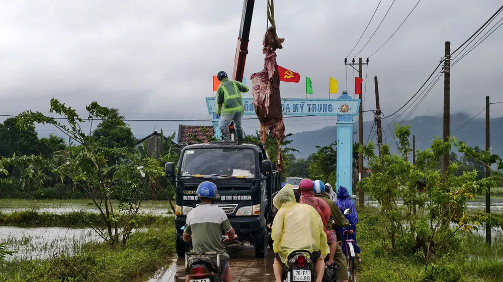 Nhiều con bò của người dân bị chết trong cơn lũ được vận chuyển đi chôn lấp.