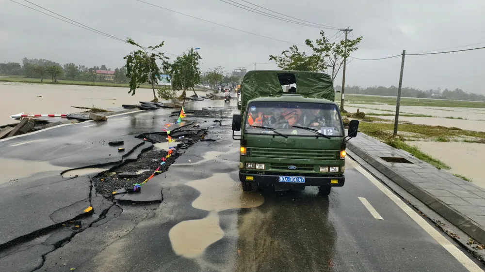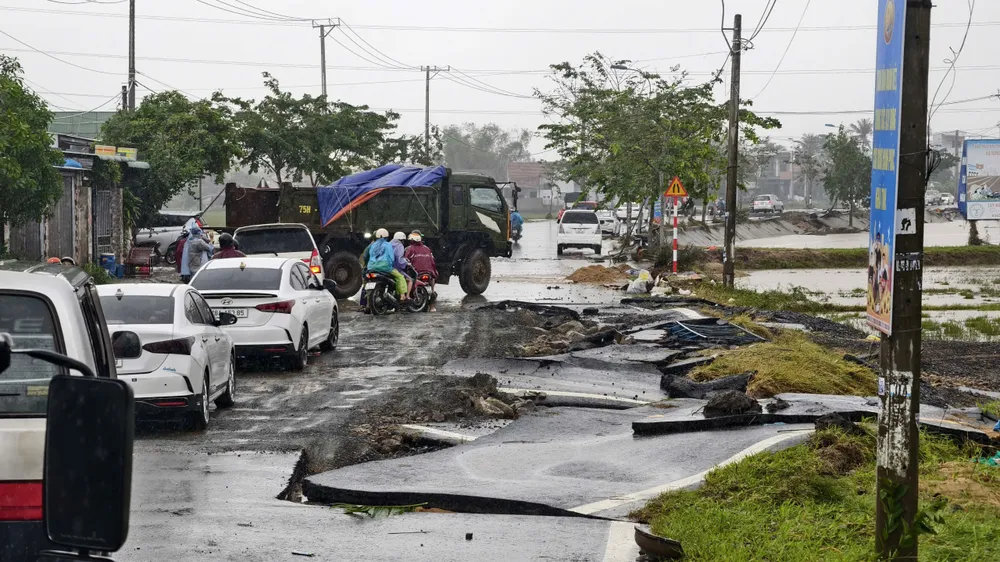Tuyến đường ĐH75 dẫn vào UBND xã Hòa Thịnh bị nước lũ cuốn bể nát, đứt gãy nghiêm trọng nhiều đoạn. Nước xiết đã khiến nhiều mảnh đường nhựa bị hất tung, xô lệch ra hai bên.
