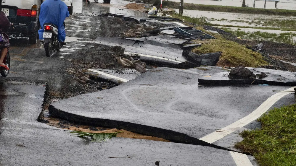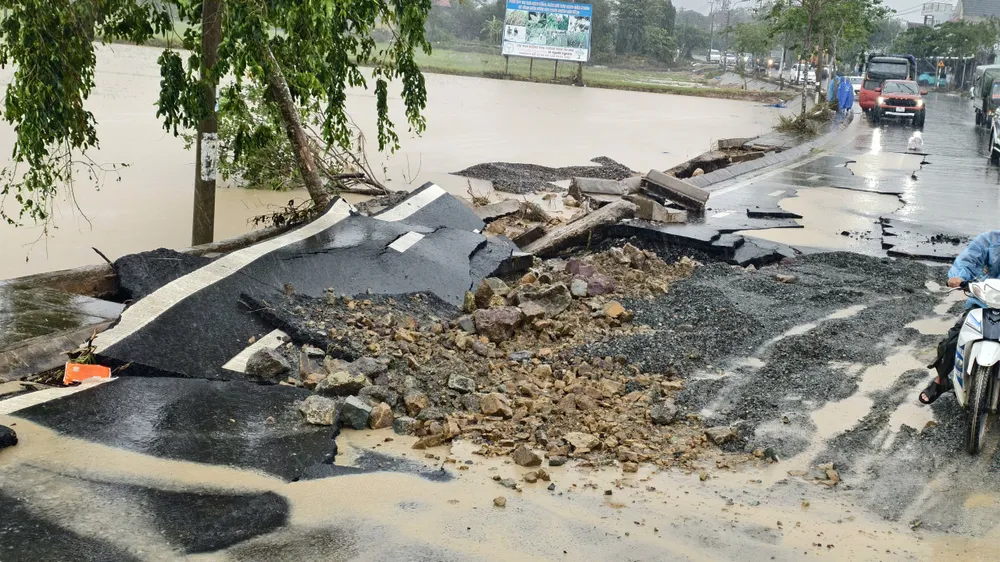 Con đường huyết mạch vào trung tâm xã bị nước lũ làm đứt gãy, bể nát.