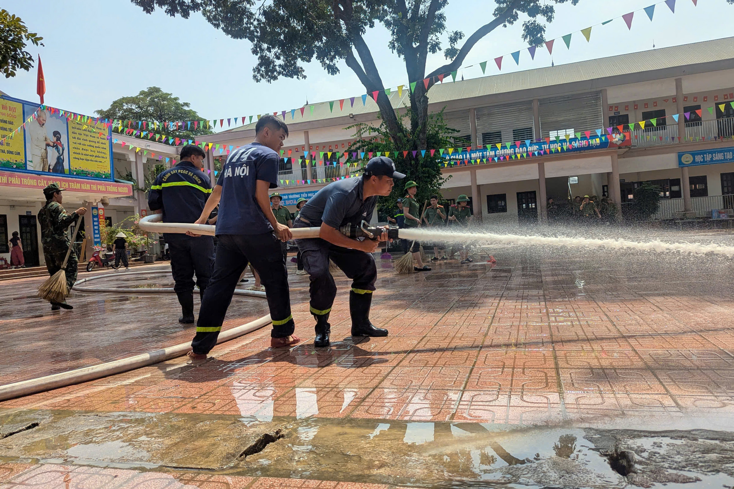 Tại các trường học, lực lượng Cảnh sát PCCC&CNCH CATP Hà Nội đã phun nước để rửa sạch bùn đất