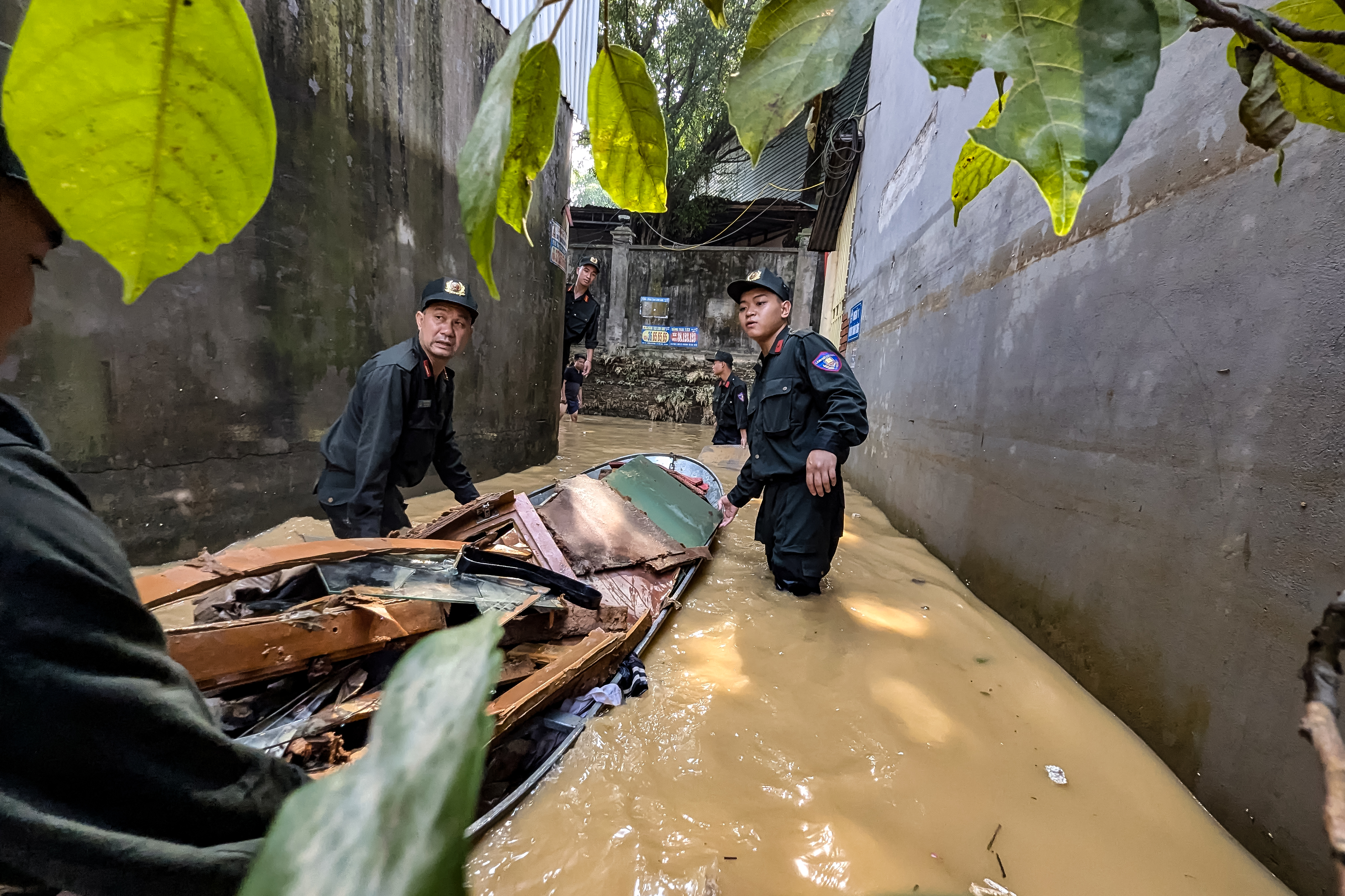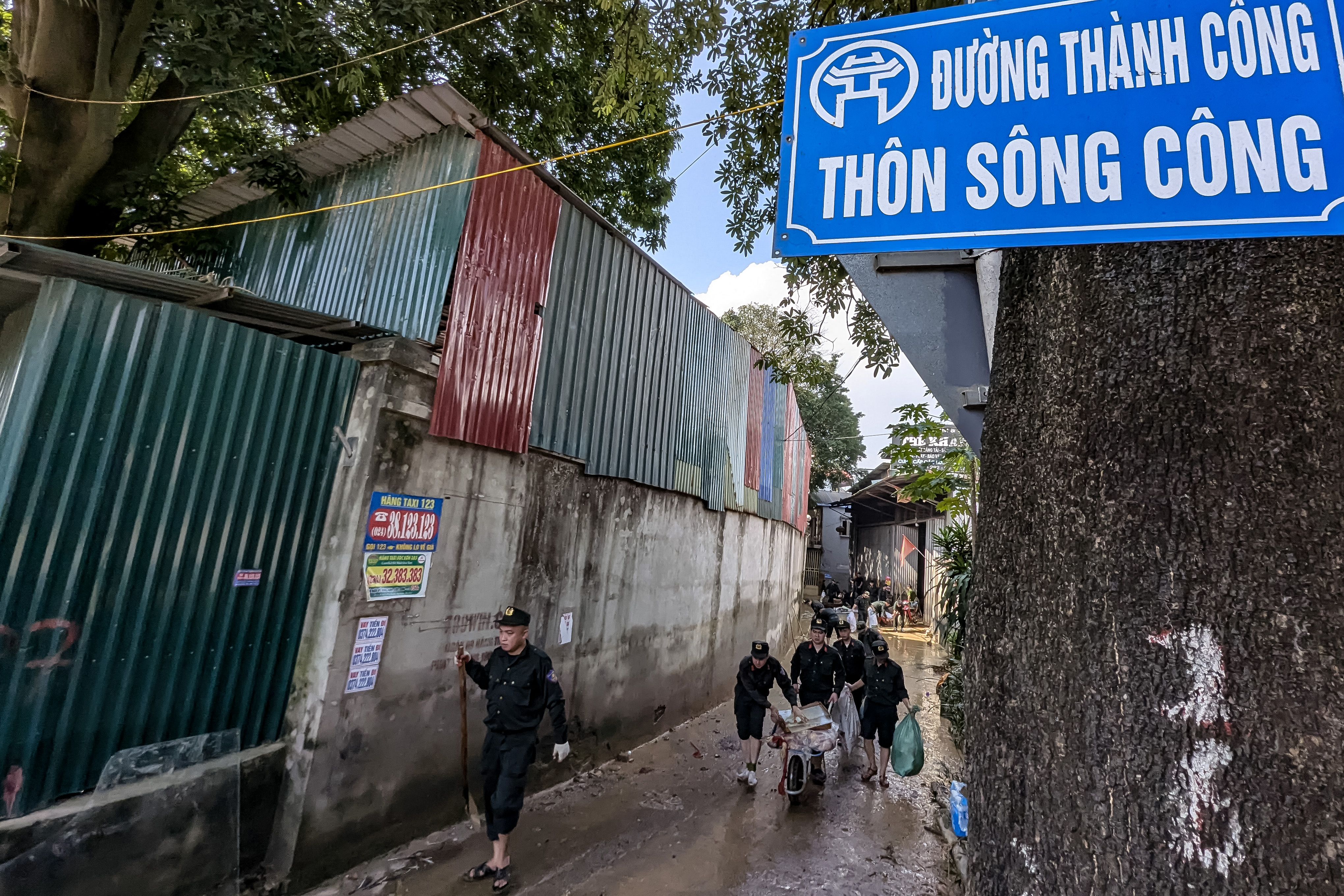 Ở thôn Sông Công, xã Trung Giã, nước lũ vẫn chưa rút hết, vẫn còn con ngõ bị ngập sâu. Cán bộ, chiến sỹ Công an Thủ đô giúp người dân vận chuyển đồ đạc ra ngoài để sẵn sàng dọn dẹp nhà cửa khi nước rút