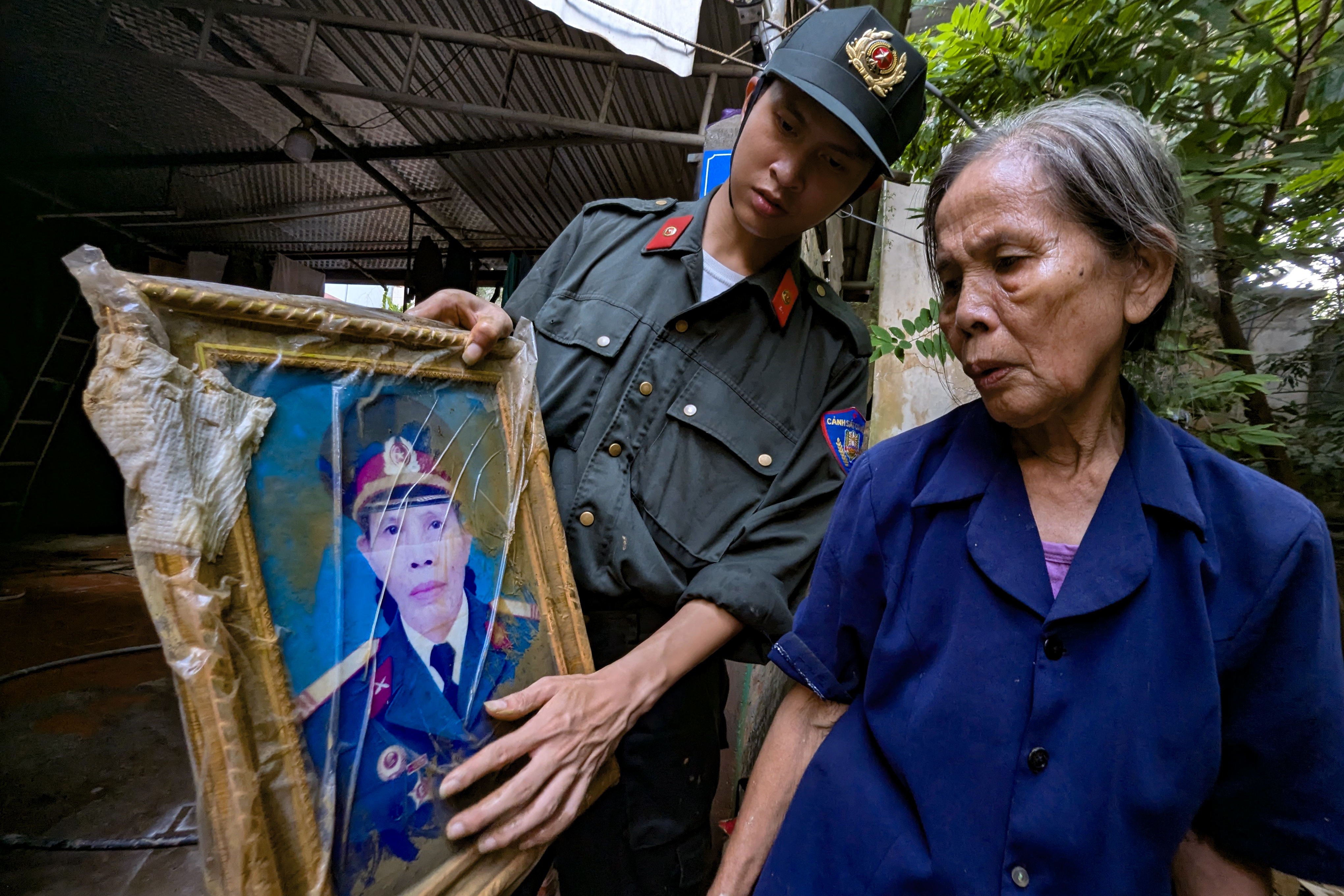 Các chiến sỹ Cảnh sát cơ động CATP Hà Nội vừa dọn dẹp vừa lục tìm trong đống bùn được tấm ảnh kỷ niệm mà bà Tuất rất quý. Bức ảnh lưu giữ lại thời bà tham gia Thanh niên xung phong chống Mỹ cứu nước.