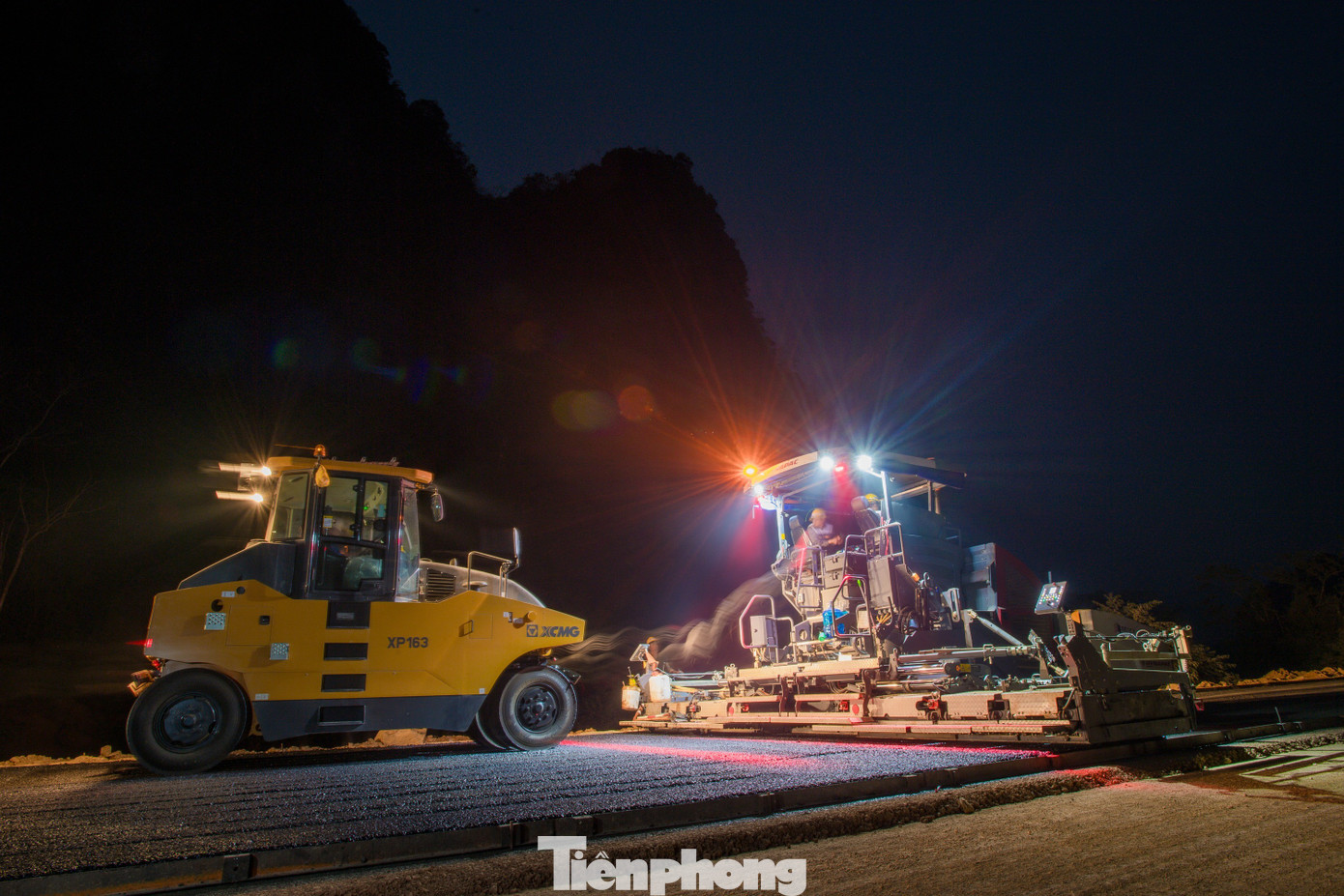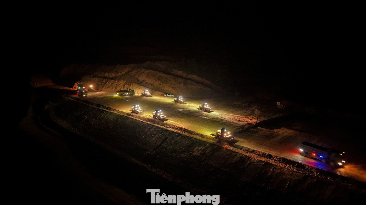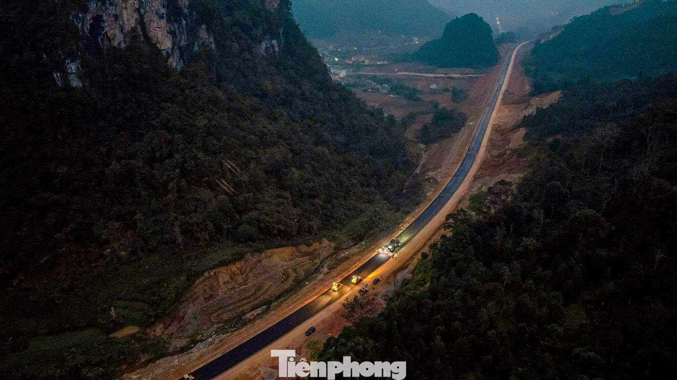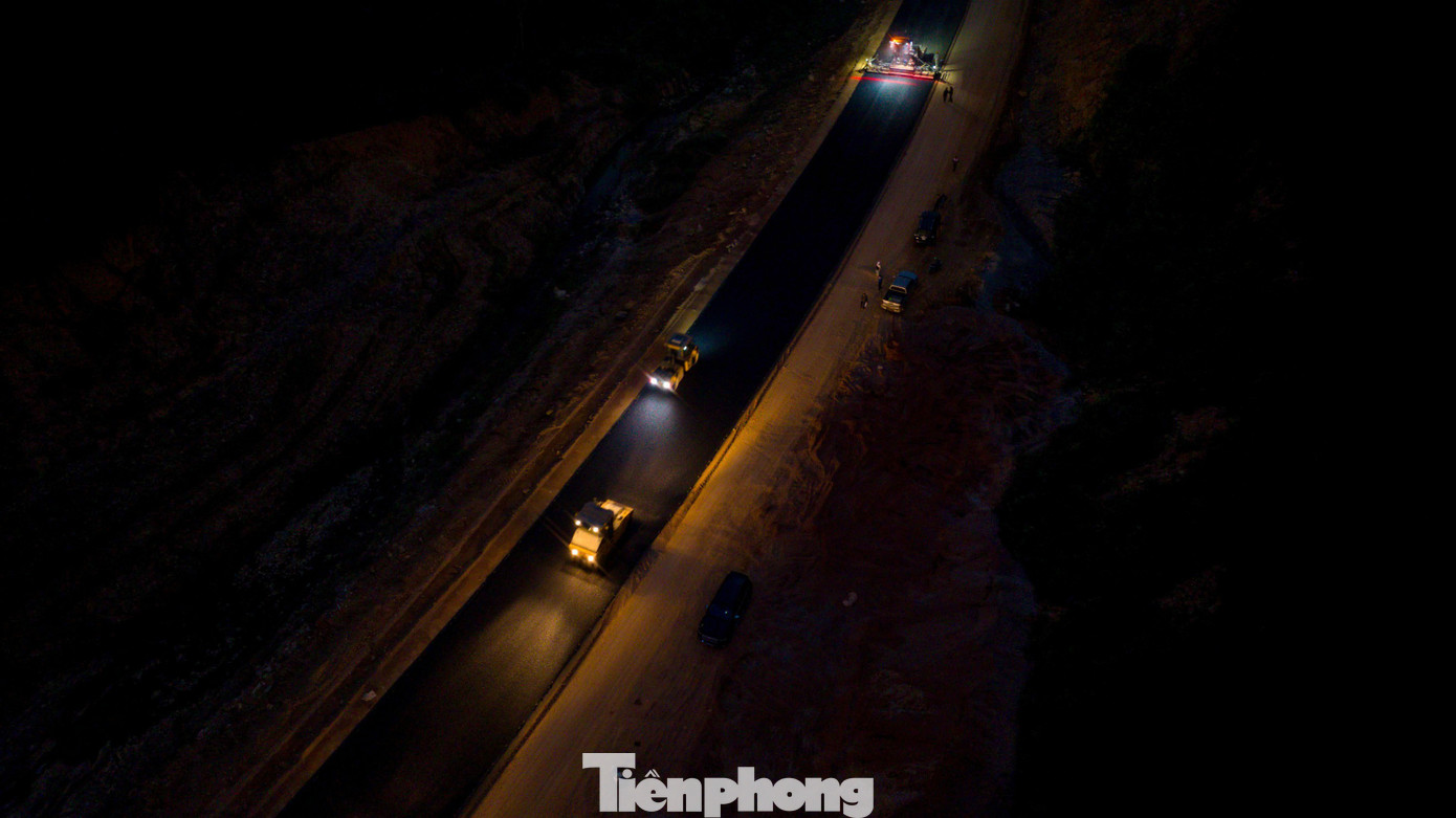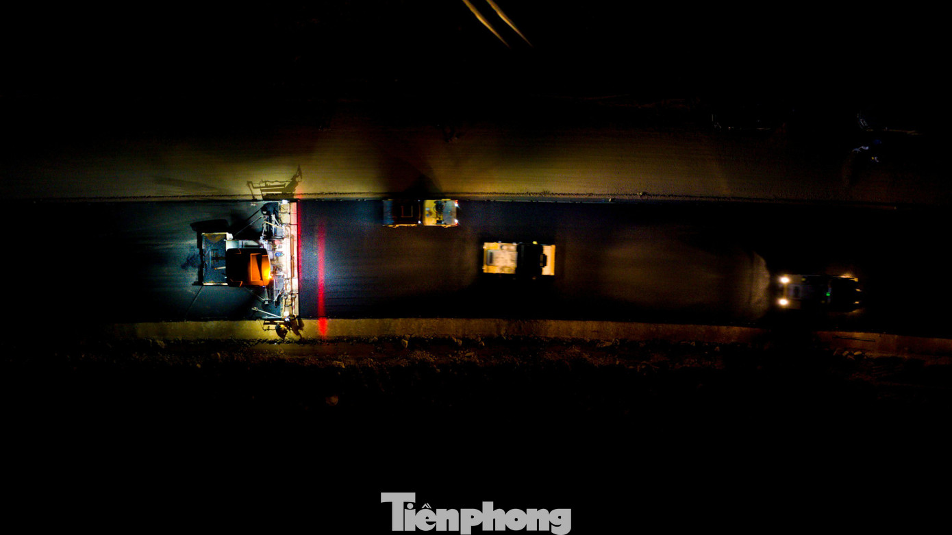 Trong giai đoạn “nước rút”, lực lượng thi công đang khẩn trương trải thảm nhựa. Công nhân và máy móc được chia làm 3 ca và nhiều mũi để sớm hoàn thiện thông xe kỹ thuật vào sáng 19/12.