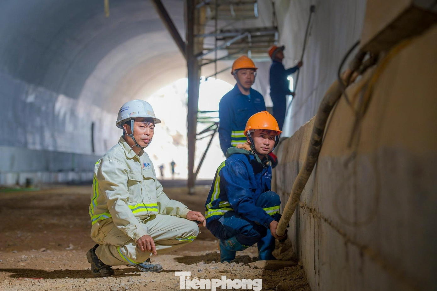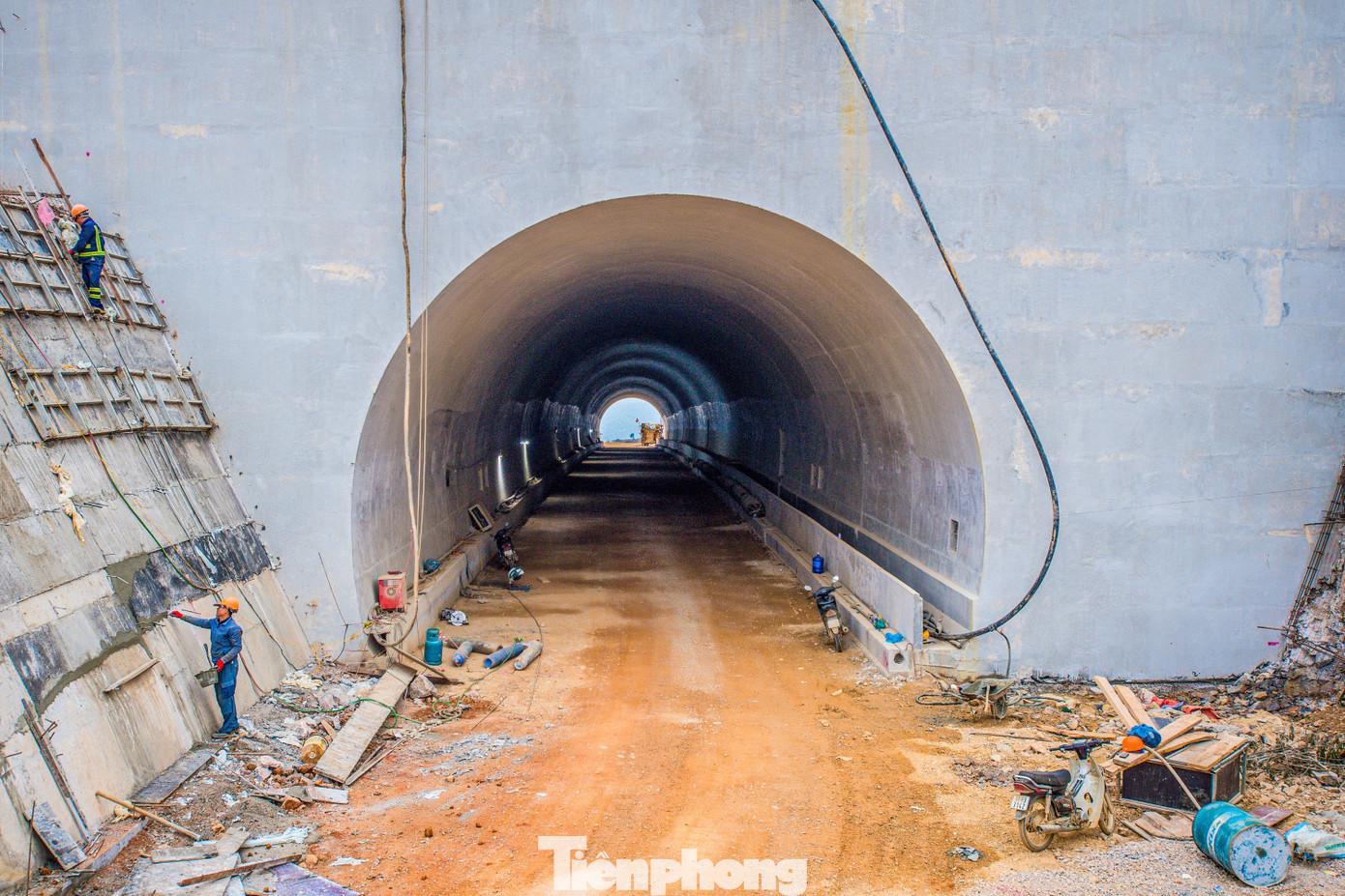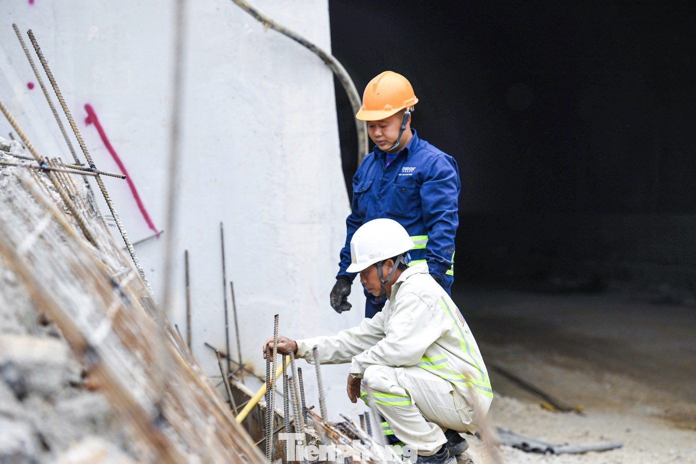 Công nhân đang thi công hạng mục bệ phần áp bên ngoài vỏ hầm và vệ sinh ống hầm.