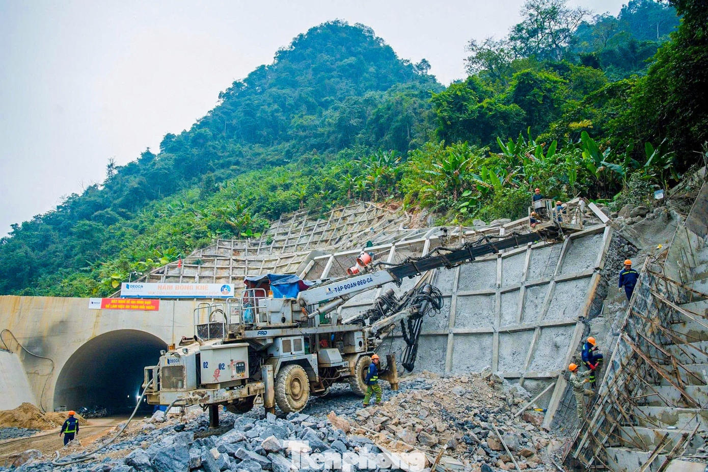Khu vực hầm Đông Khê (dài gần 500m), các đội thi công đang tập trung hoàn thiện tường chắn, hệ thống thoát nước, mái cơ, khu quảng trường và tuyến đường nối hai cửa hầm.