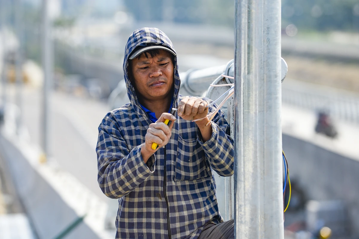 Công nhân đang khẩn trương lắp đặt và đấu nối hệ thống điện chiếu sáng trên cầu.