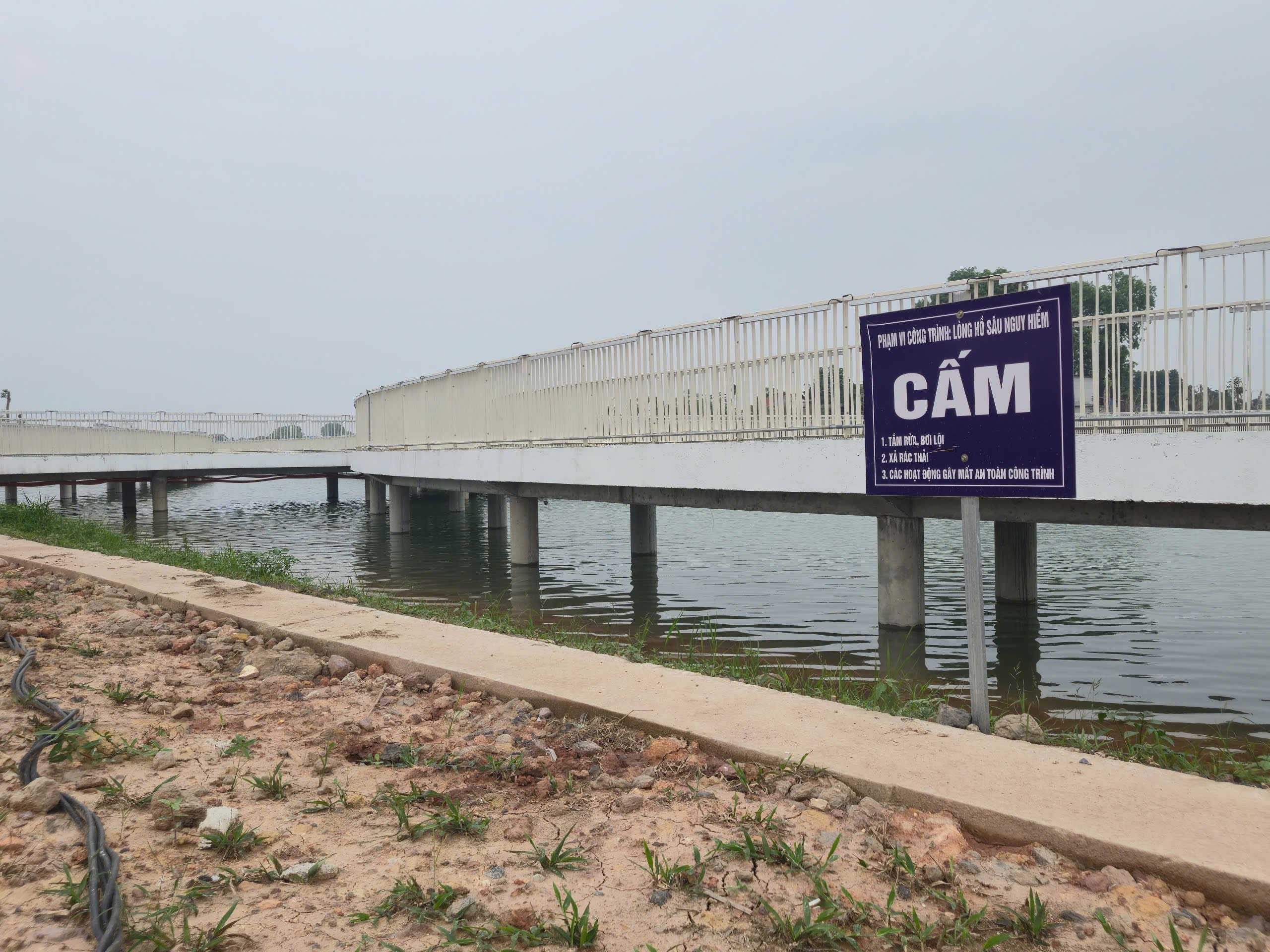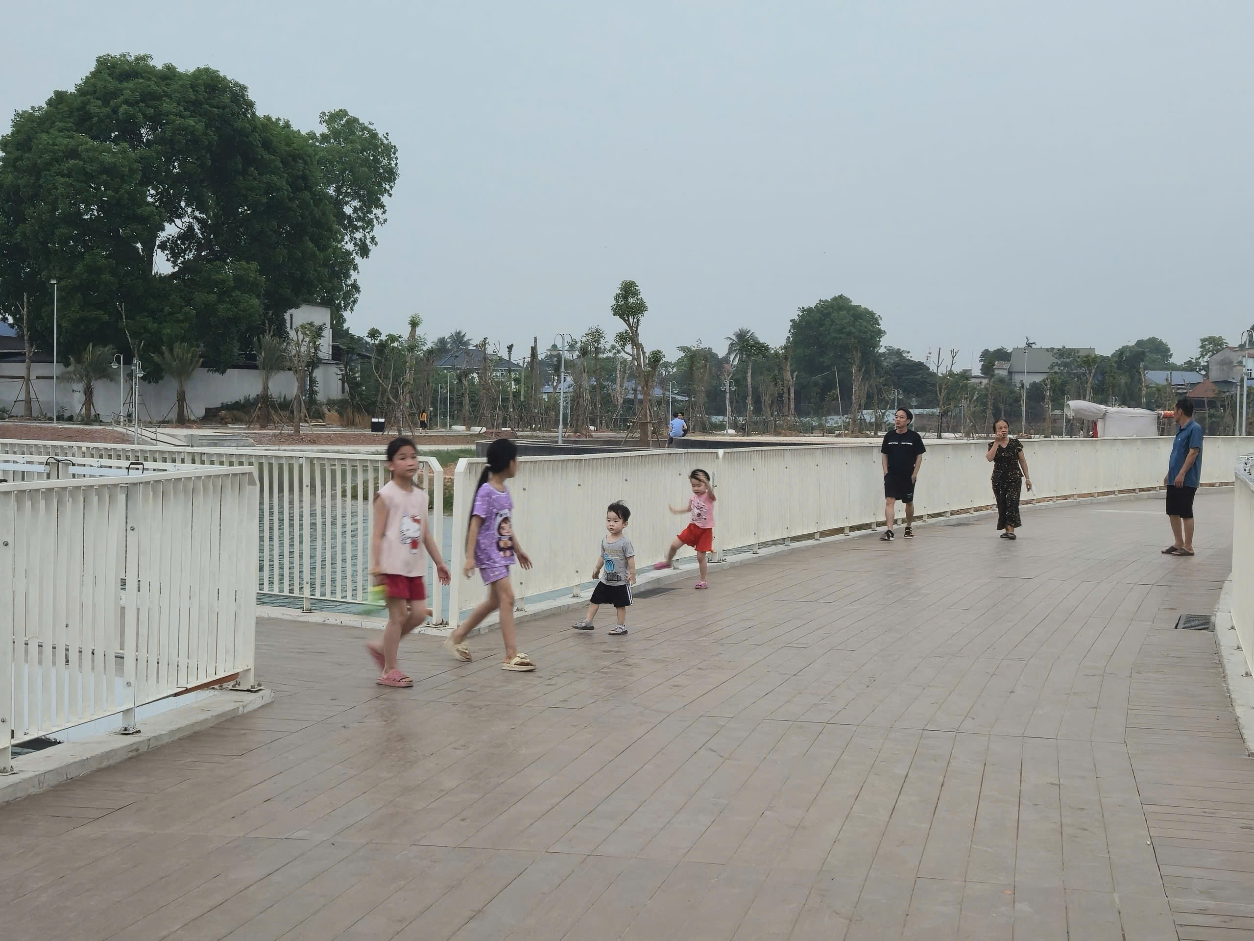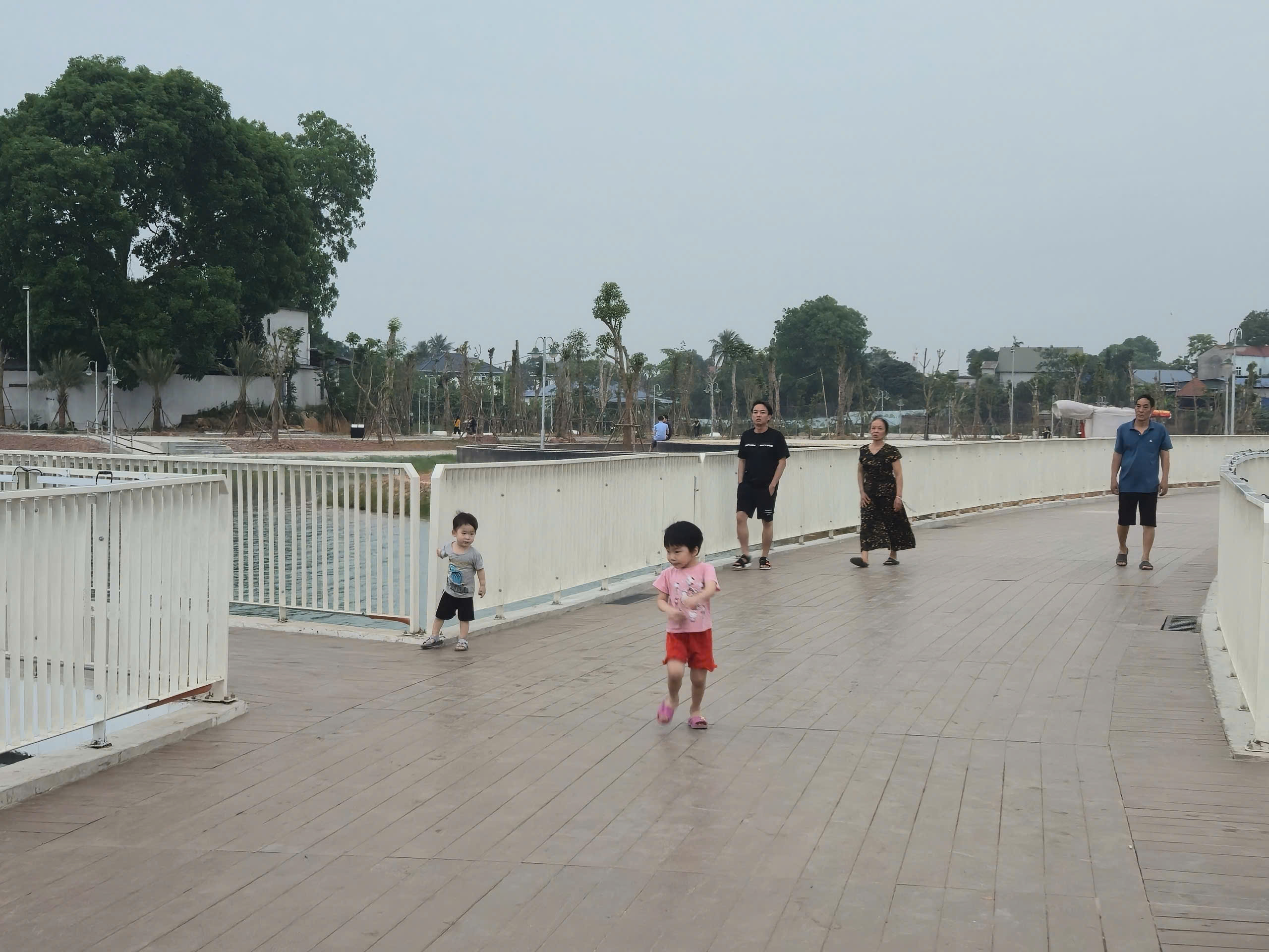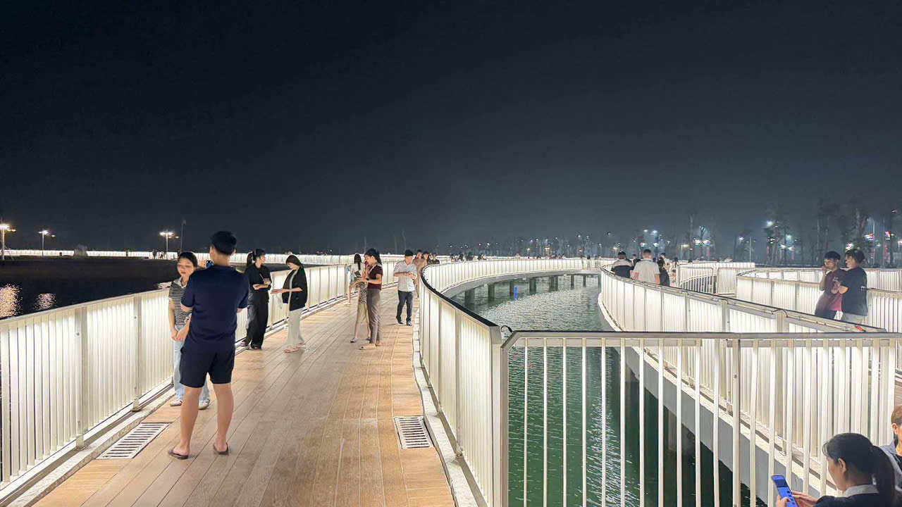 Điểm nhấn nổi bật là hệ thống cầu đi bộ trên mặt hồ dài gần 600m, kết cấu bê tông kiên cố, lan can cao khoảng 1,4m đảm bảo an toàn. Mặt cầu được lát vật liệu gỗ nhựa composite (gỗ pha bột đá), có khả năng chống trơn trượt, chịu mưa nắng, phù hợp cảnh quan.