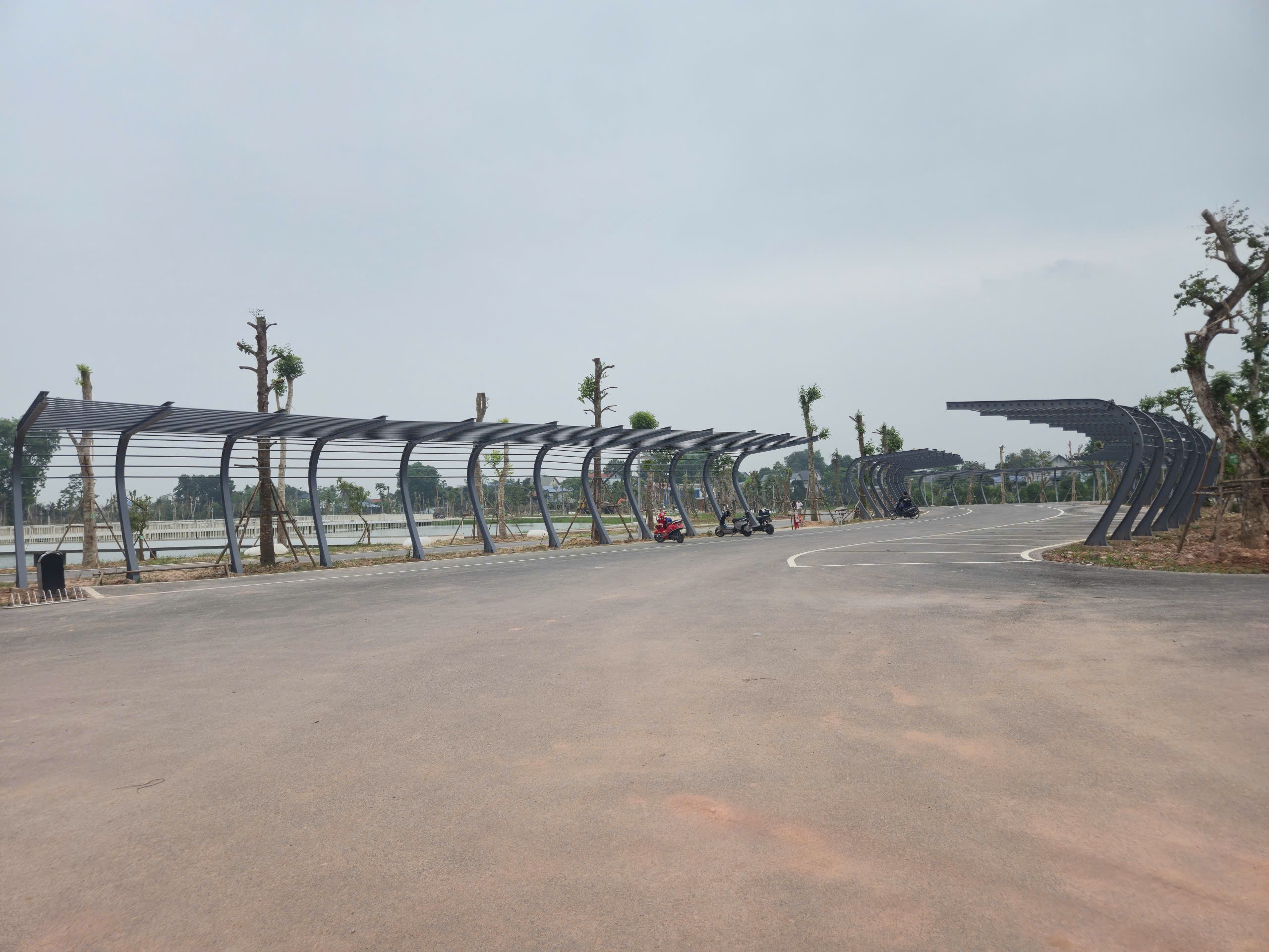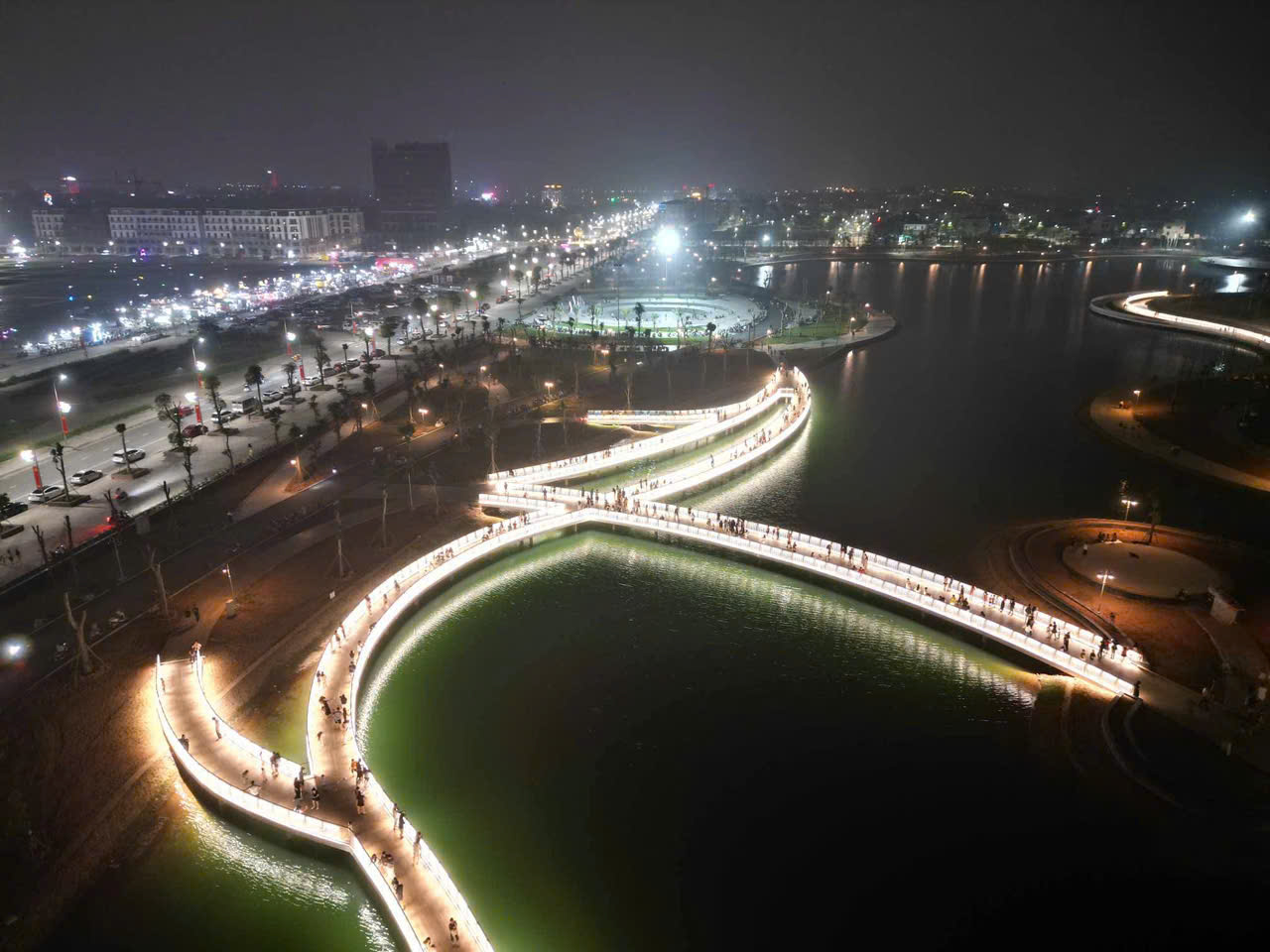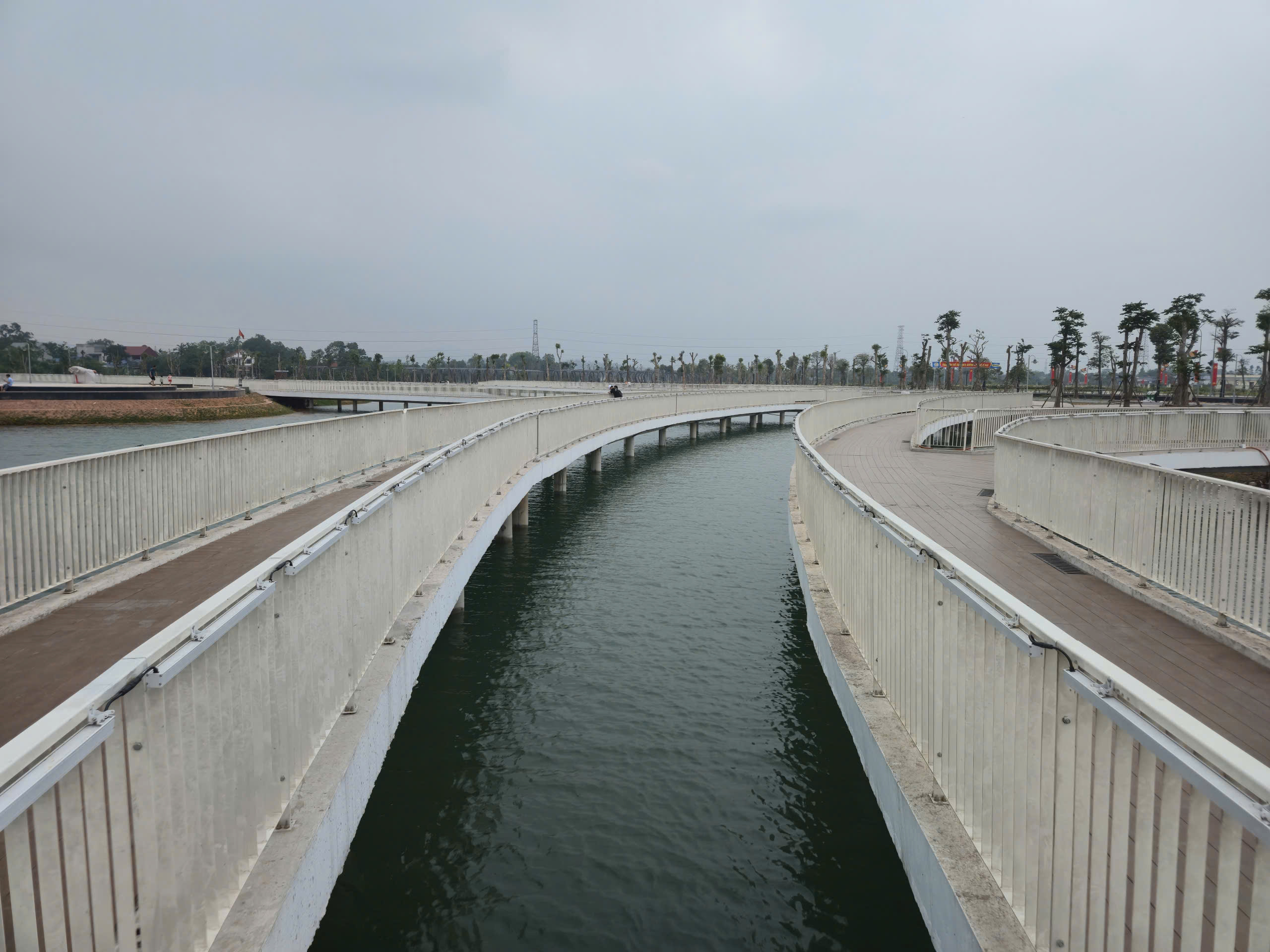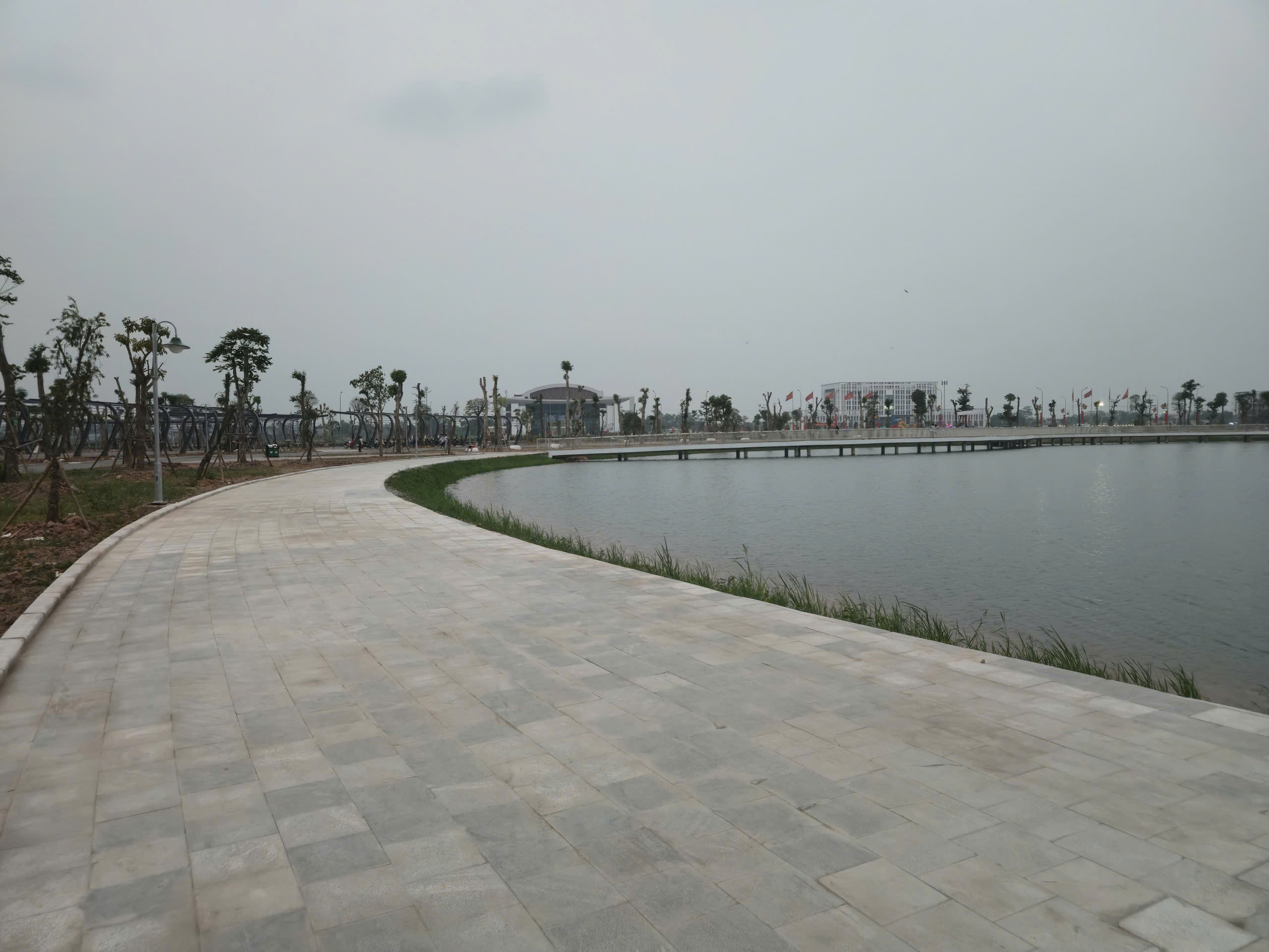 Điểm nhấn nổi bật là hệ thống cầu đi bộ trên mặt hồ dài gần 600m, kết cấu bê tông kiên cố, lan can cao khoảng 1,4m đảm bảo an toàn. Mặt cầu được lát vật liệu gỗ nhựa composite (gỗ pha bột đá), có khả năng chống trơn trượt, chịu mưa nắng, phù hợp cảnh quan.