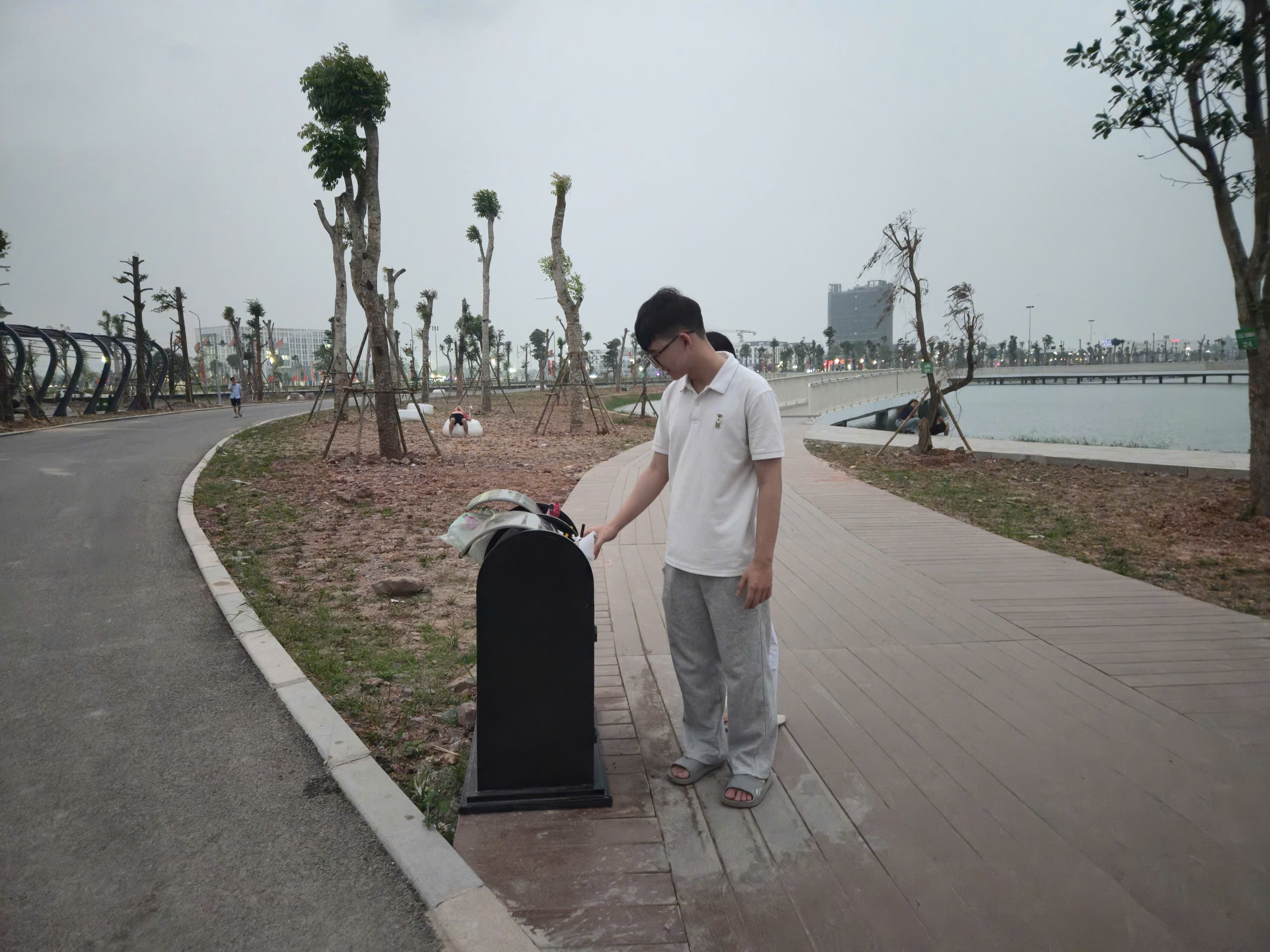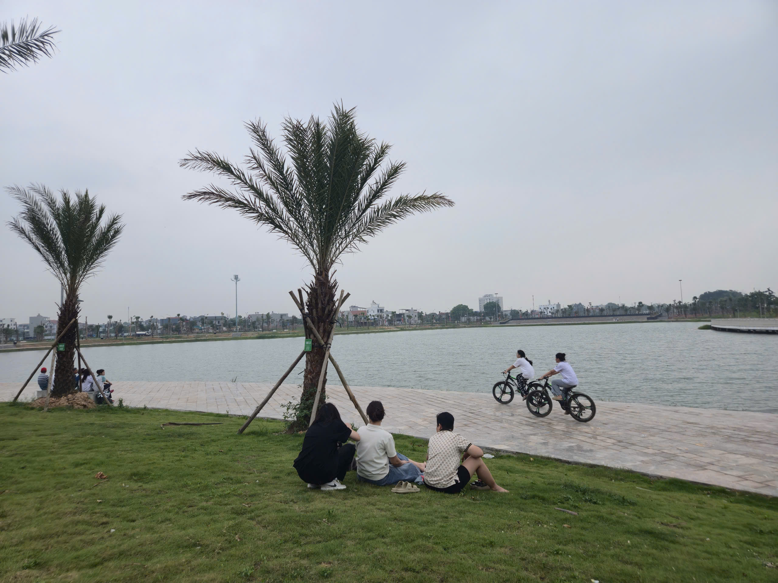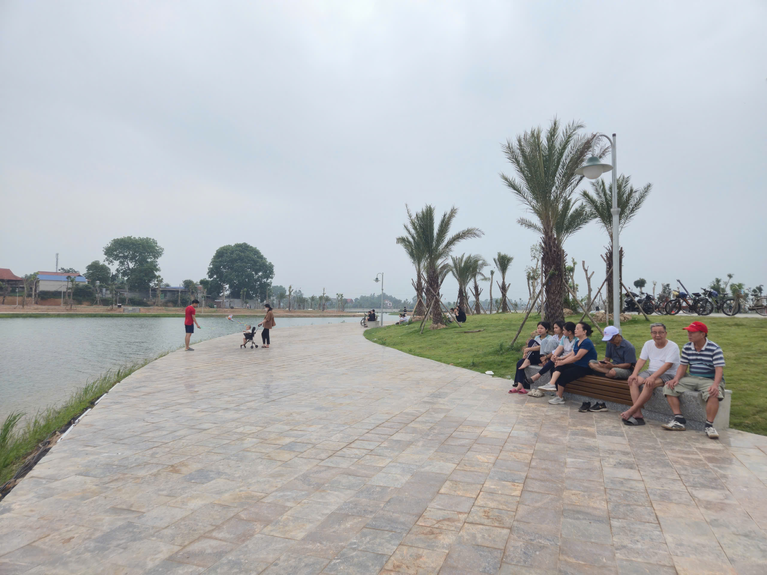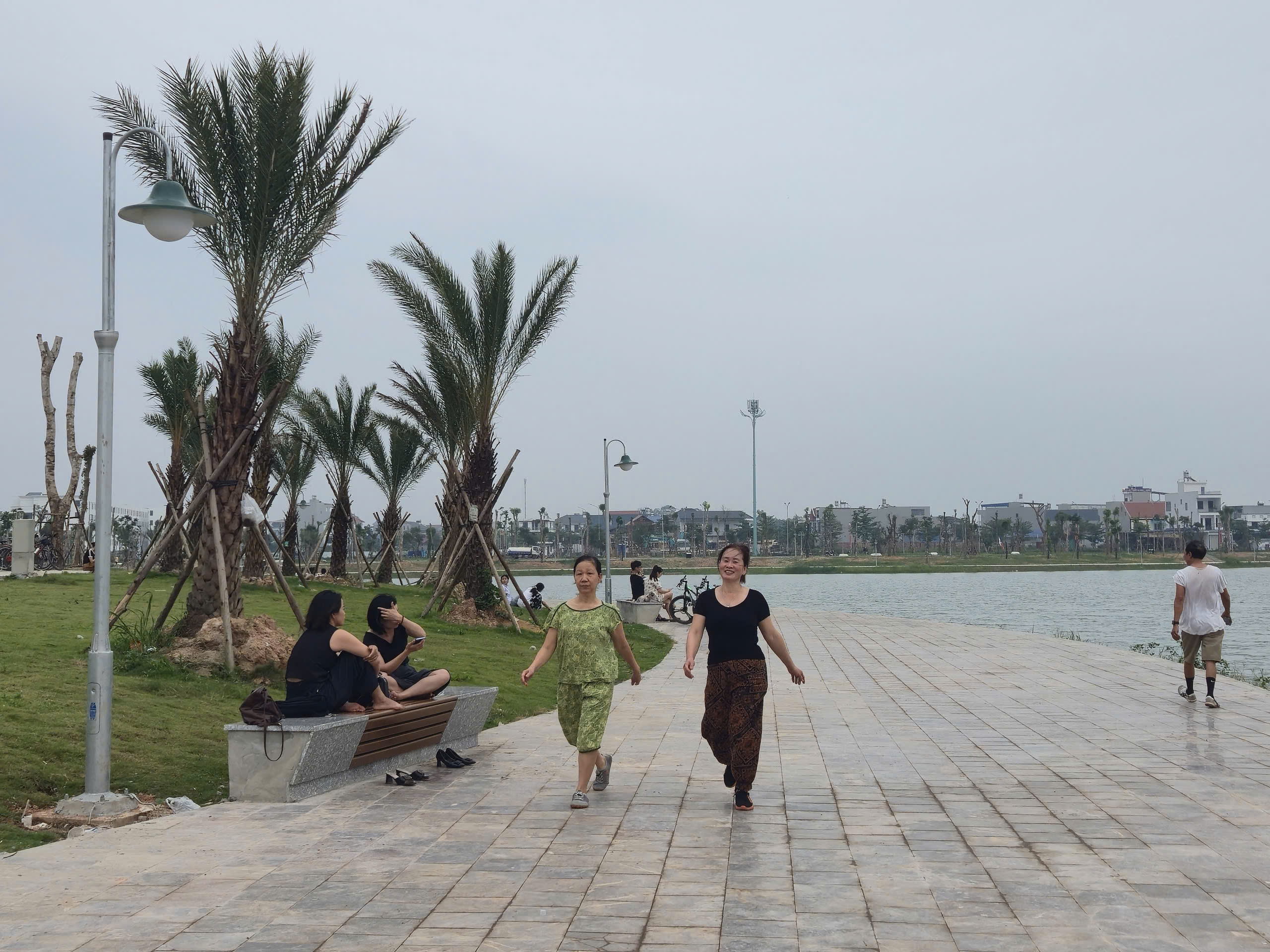 Điểm nhấn nổi bật là hệ thống cầu đi bộ trên mặt hồ dài gần 600m, kết cấu bê tông kiên cố, lan can cao khoảng 1,4m đảm bảo an toàn. Mặt cầu được lát vật liệu gỗ nhựa composite (gỗ pha bột đá), có khả năng chống trơn trượt, chịu mưa nắng, phù hợp cảnh quan.