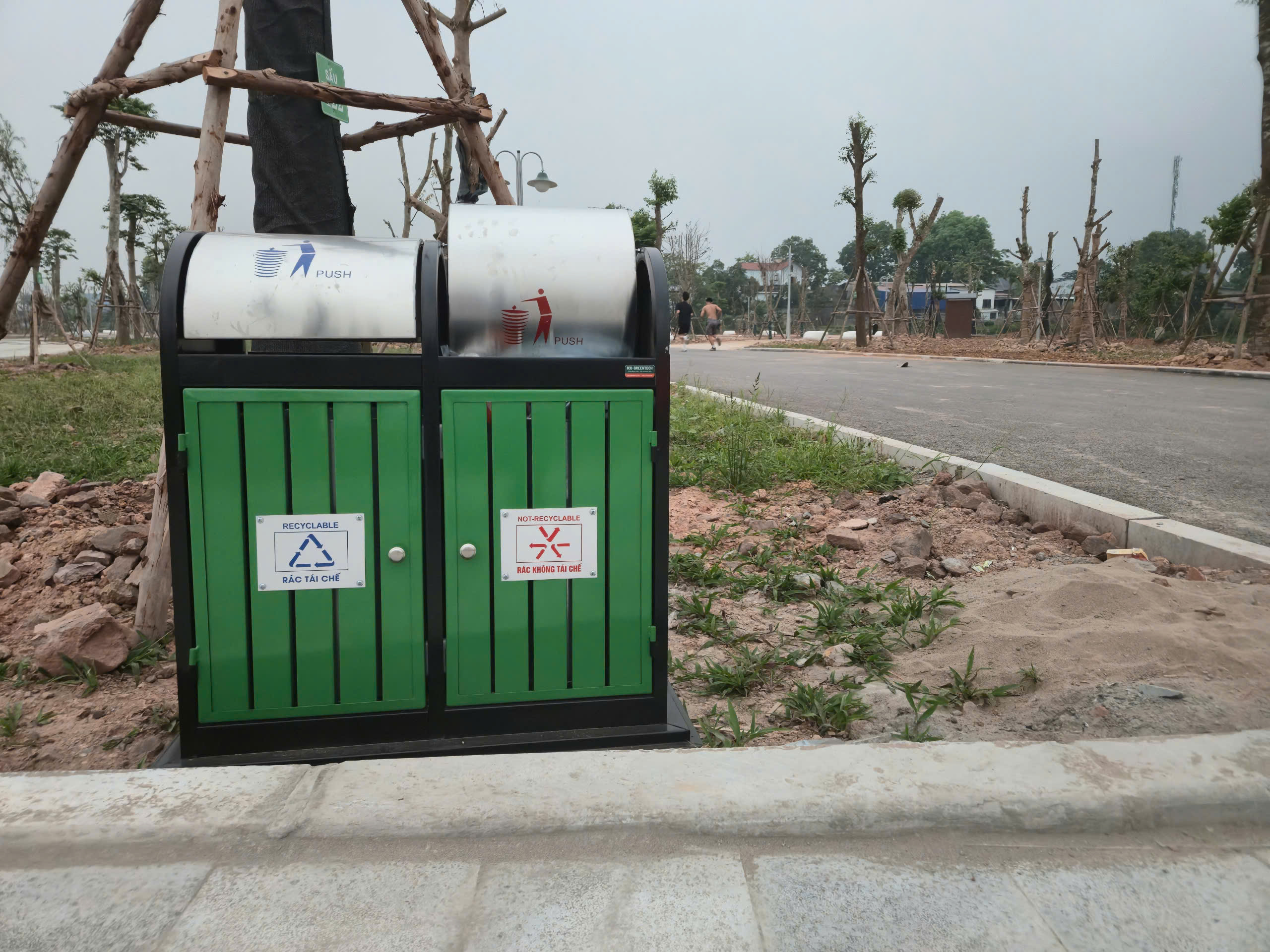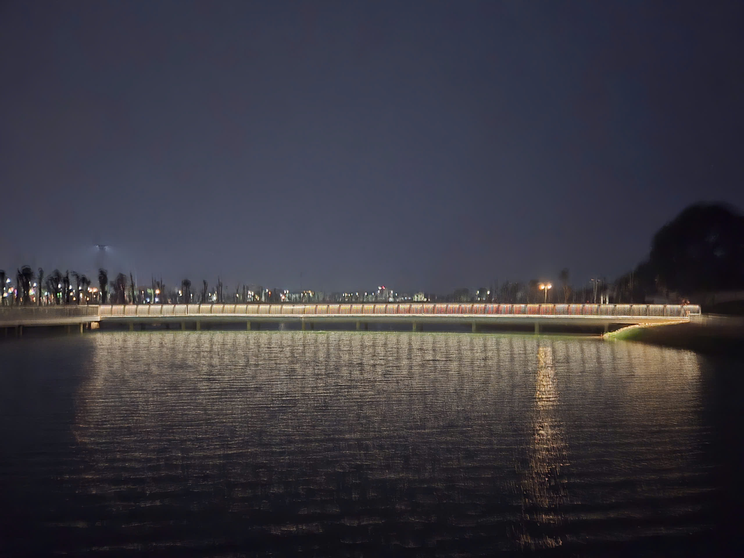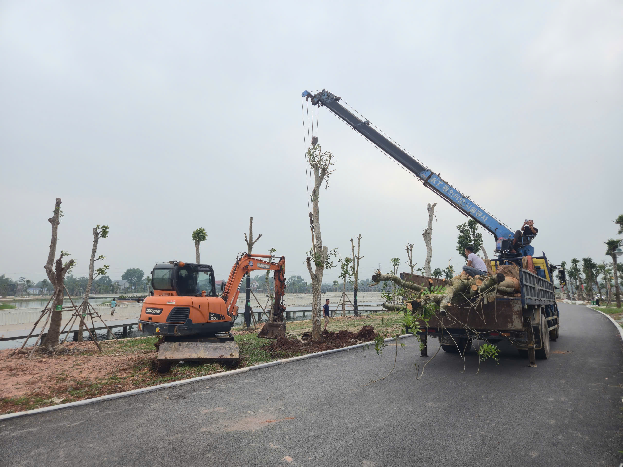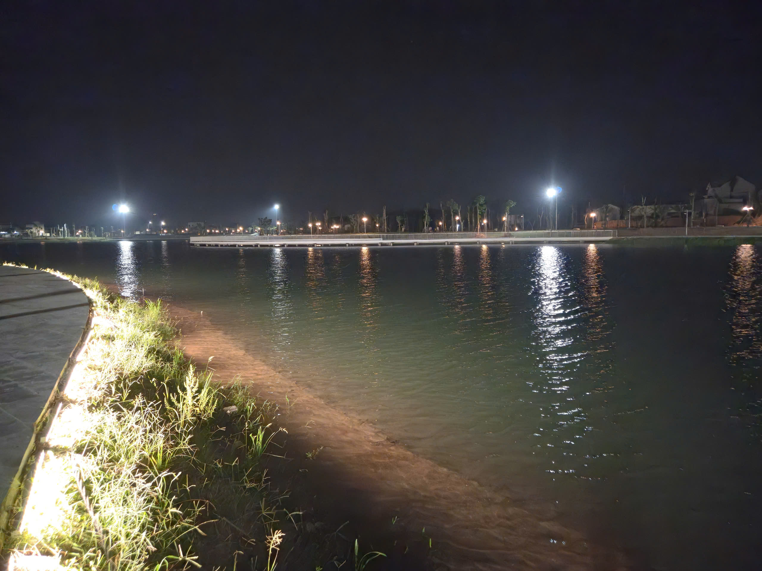 Điểm nhấn nổi bật là hệ thống cầu đi bộ trên mặt hồ dài gần 600m, kết cấu bê tông kiên cố, lan can cao khoảng 1,4m đảm bảo an toàn. Mặt cầu được lát vật liệu gỗ nhựa composite (gỗ pha bột đá), có khả năng chống trơn trượt, chịu mưa nắng, phù hợp cảnh quan.