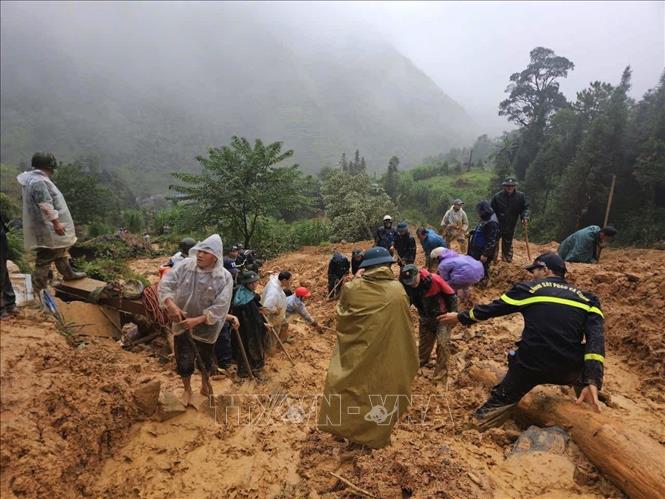 Tìm kiếm nạn nhân mất tích do mưa lũ, sạt lở đất tại xã Lũng Cú, tỉnh Tuyên Quang. Ảnh: TTXVN phát