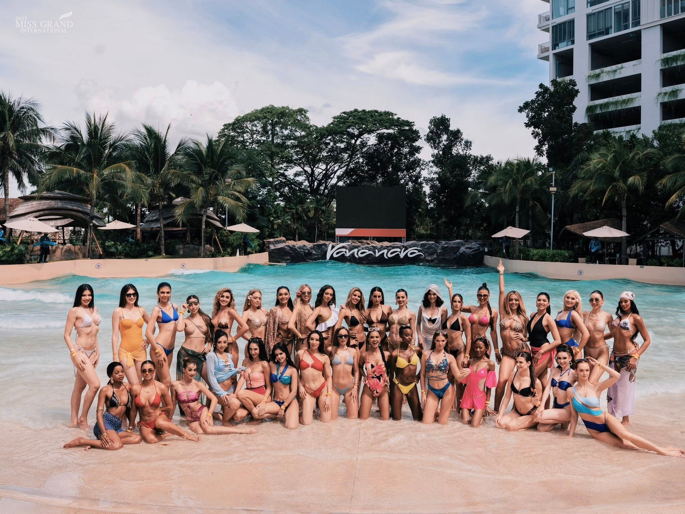 Ngày 8/10, 77 thí sinh của cuộc thi Hoa hậu Hòa bình Quốc tế 2025 có hoạt động thăm công viên nước ở Thái Lan. Dàn người đẹp mặc áo tắm, khoe hình thể quyến rũ bên hồ bơi khổng lồ.
