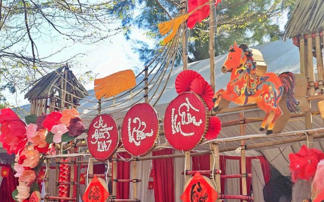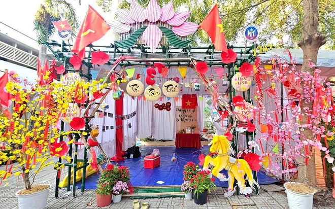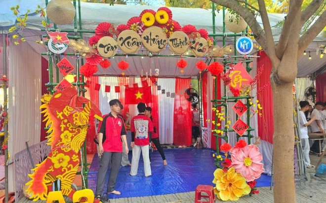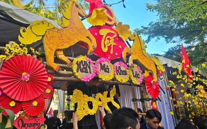 Học sinh thích thú lấy hình tượng ngựa để trang trí cho hội trại Tết Bính Ngọ. Ảnh: TVT