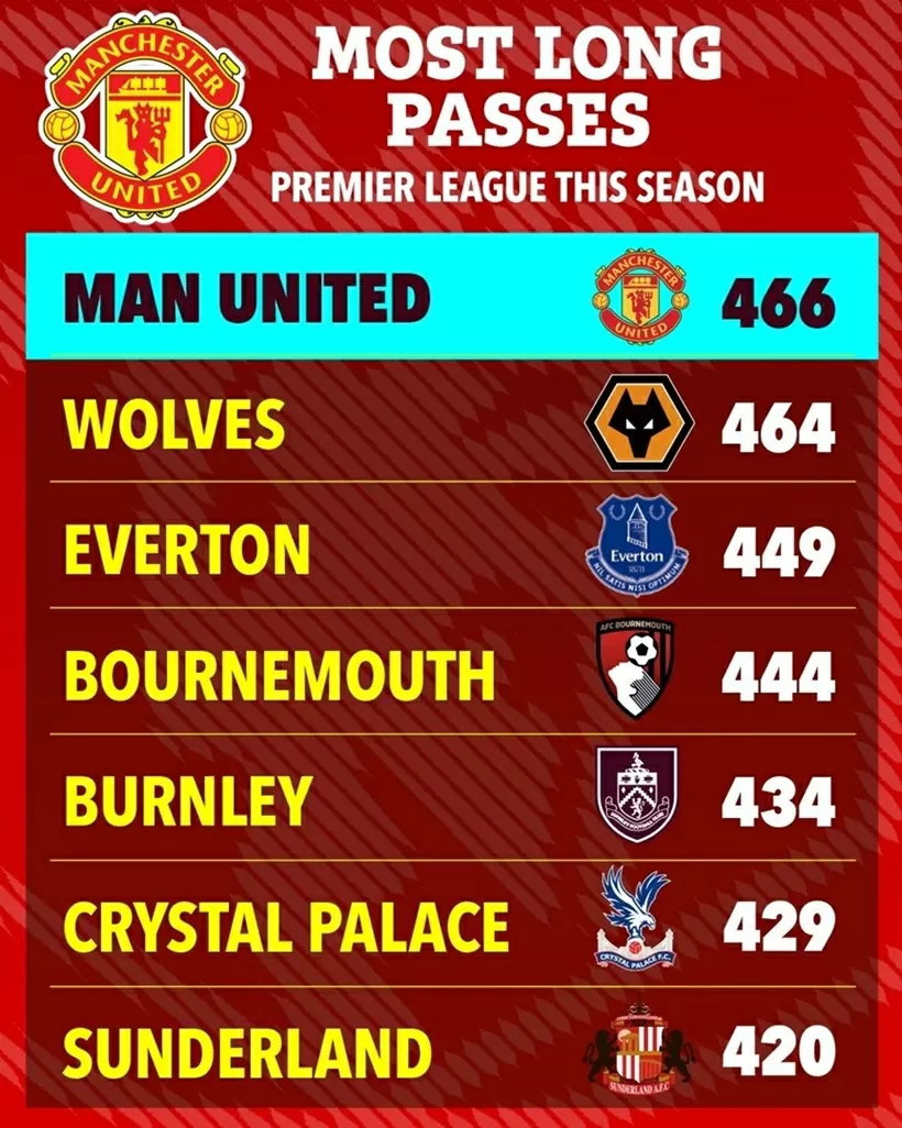 Những câu lạc bộ xếp sau MU về thống kê những đường chuyền dài hầu hết là những đội bóng chơi phòng ngự - phản công đặc thù, gồm Wolves (464), Everton (449), Bournemouth (444), Crystal Palace (429) hay Sunderland (420)…