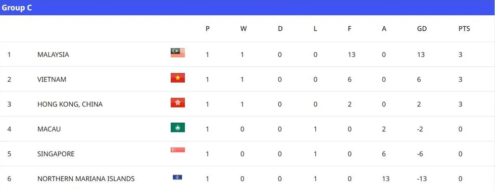 Thầy trò HLV Roland của U-17 Việt Nam ra quân trận đầu bảng C vòng loại U-17 châu Á đánh bại U-17 Singapore 6-0, trong khi Malaysia thắng U-17 Quần đảo Bắc Mariana 13-0, còn Hong Kong thắng Macau 2-0.