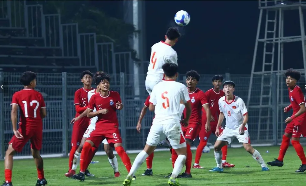 Học trò HLV Cristiano Roland cùng U-17 Việt Nam ra quân trận đầu đánh bại U-17 Singapore 6-0. Ảnh: AFC.