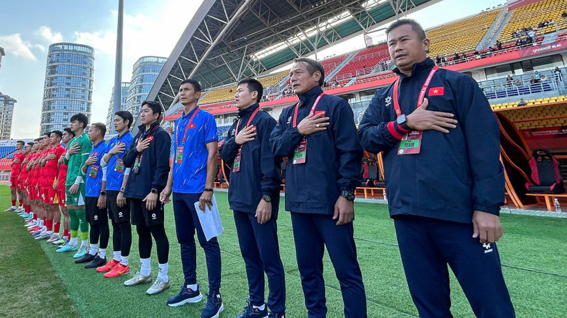 Huấn luyện viên Đinh Hồng Vinh (ngoài cùng bên phải) hài lòng về sự thể hiện của các học trò trước đối thủ mạnh U22 Uzbekistan. (Ảnh: VFF)