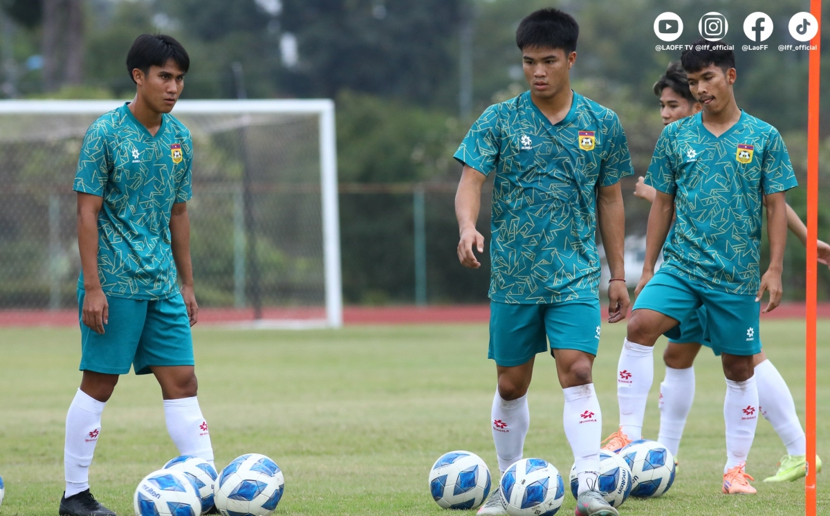 Các cầu thủ Lào tập luyện trước trận đấu. (Ảnh: LFF).