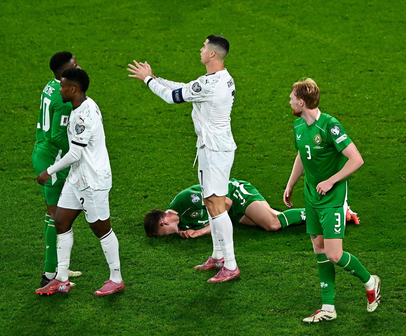 Ronaldo bị đuổi khỏi sân ở phút 62 sau tình huống thúc cùi chỏ vào Dara O'Shea. Ban đầu, CR7 chỉ nhận thẻ vàng. Trọng tài đã xem lại VAR và quyết định rút thẻ đỏ cho thủ quân tuyển Bồ Đào Nha.