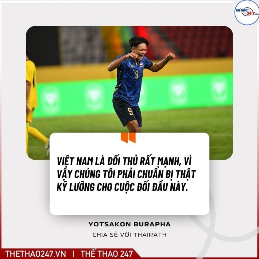 Sau trận bán kết, Yotsakorn Burapha cũng dành sự tôn trọng lớn cho U22 Việt Nam. Khi được hỏi về đối thủ trong trận chung kết, tiền đạo của U22 Thái Lan nhấn mạnh: “Đó sẽ là một trận đấu hay. Việt Nam là đối thủ rất mạnh, vì vậy chúng tôi phải chuẩn bị thật kỹ lưỡng cho cuộc đối đầu này.”