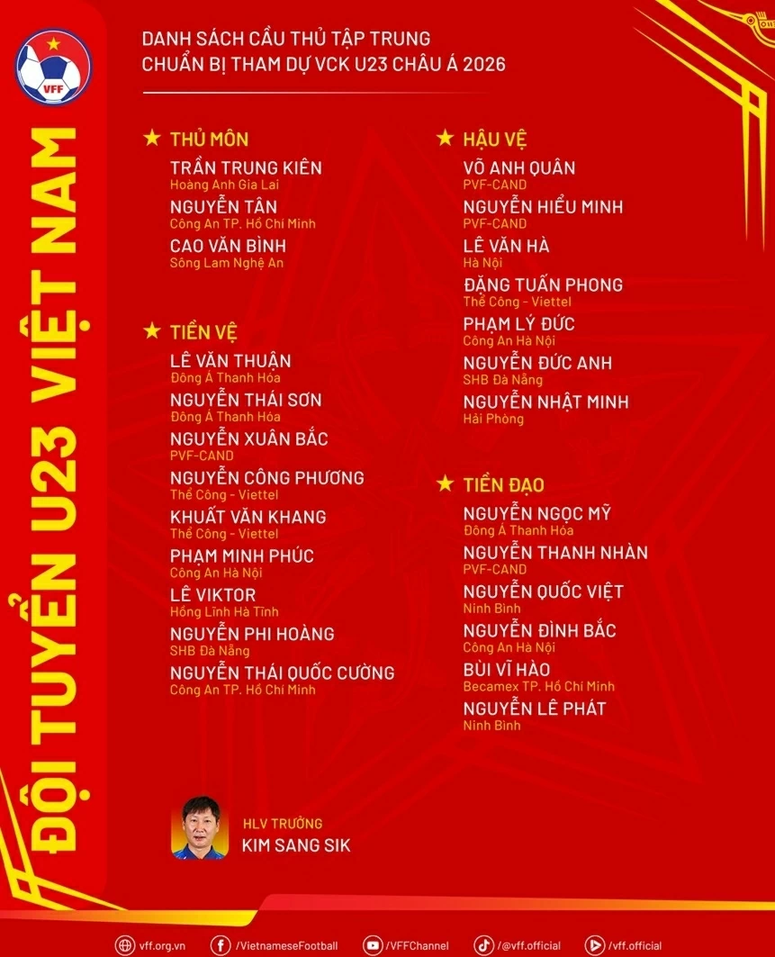 Chiều tối qua (22/12), Liên đoàn bóng đá Việt Nam (VFF) công bố danh sách 25 cầu thủ tham dự VCK U23 châu Á 2026, giải đấu diễn ra vào đầu năm tại Saudi Arabia.