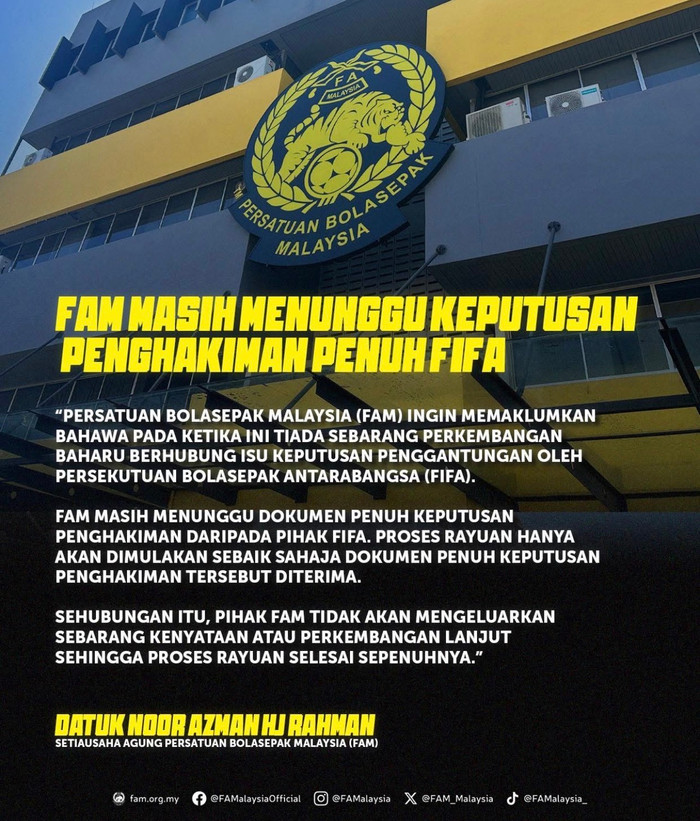 Liên đoàn Bóng đá Malaysia (FAM) xin thông báo rằng hiện tại chưa có bất kỳ diễn biến mới nào liên quan đến quyết định đình chỉ của Liên đoàn Bóng đá Thế giới (FIFA).