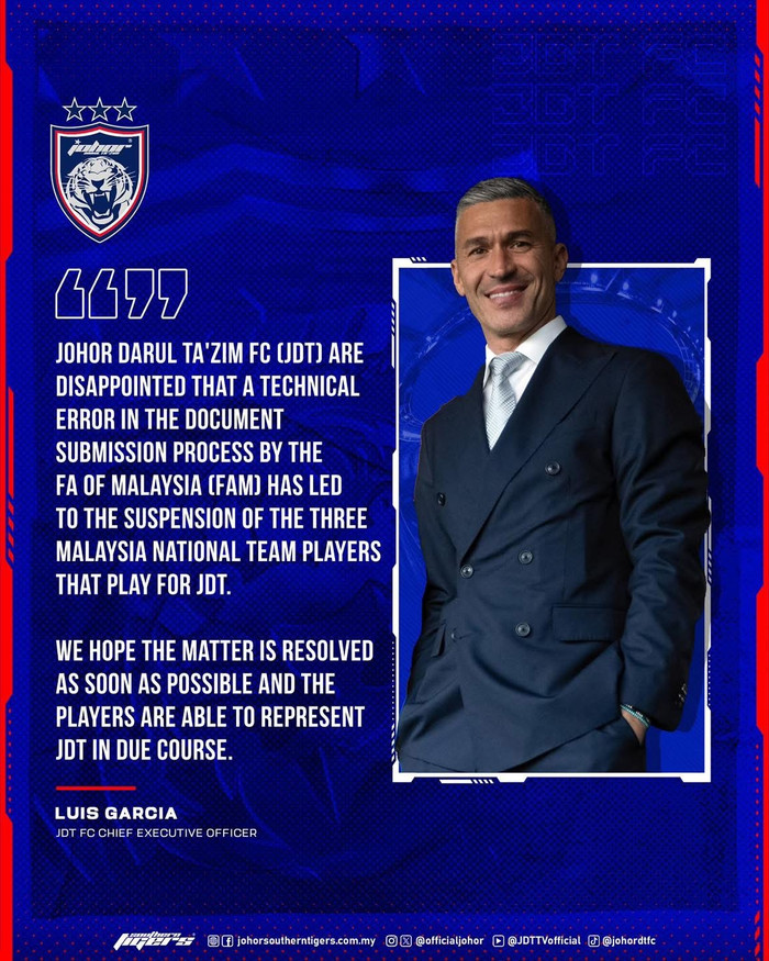 Trong khi đó, trang chủ CLB Malaysia, Johor Darul Ta’zim dẫn lời Luis Garcia (Giám đốc Điều hành CLB Johor Darul Ta’zim): “CLB Johor Darul Ta’zim (JDT) thất vọng vì xảy ra lỗi kỹ thuật trong quá trình gửi hồ sơ của Liên đoàn Bóng đá Malaysia (FAM), dẫn đến việc 3 cầu thủ tuyển quốc gia Malaysia đang khoác áo JDT bị treo giò.