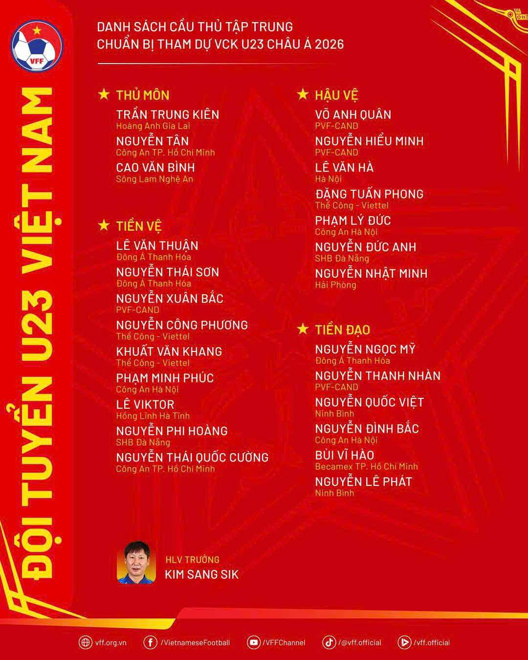 Chiều 22/12, HLV Kim Sang Sik công bố danh sách tập trung U23 Việt Nam chuẩn bị cho chiến dịch VCK U23 châu Á 2026. Đúng như dự đoán, chiến lược gia người Hàn Quốc sử dụng lại toàn bộ các cầu thủ vừa tham dự SEA Games 33, đồng thời gọi thêm 2 cầu thủ nữa là Vỹ Hào và Văn Hà.