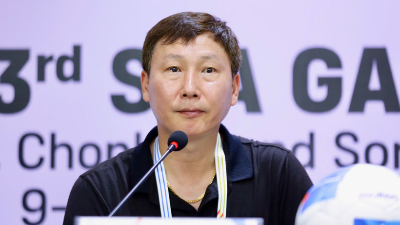 Huấn luyện viên Kim Sang Sik tại buổi họp báo sau trận thắng 2-1 U22 Lào. (Ảnh: VFF)