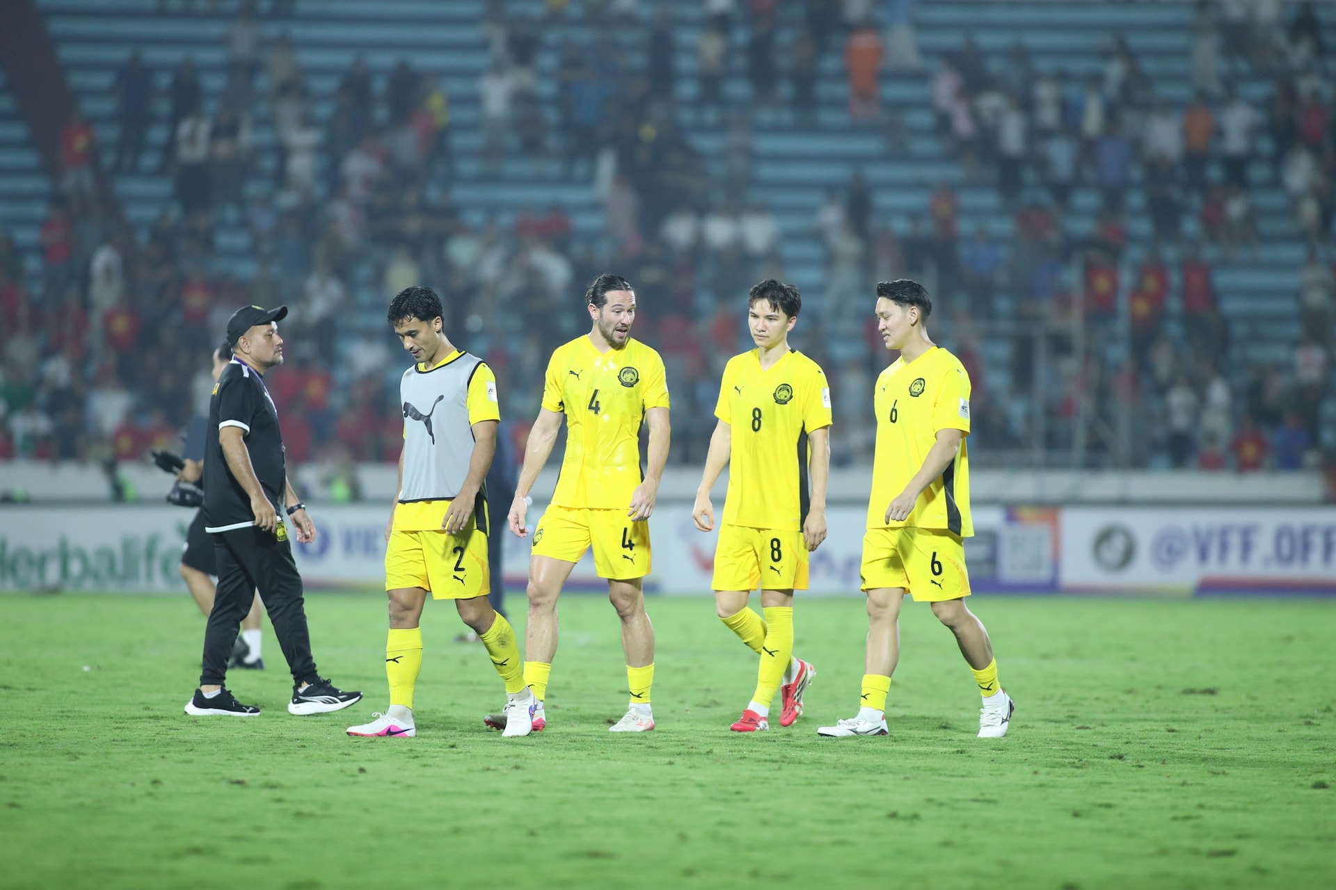 Sau trận đấu, các cầu thủ Malaysia thể hiện sự buồn bã khi không thể tạo nên bất ngờ trên sân của tuyển Việt Nam. Ảnh: Ngọc Tú