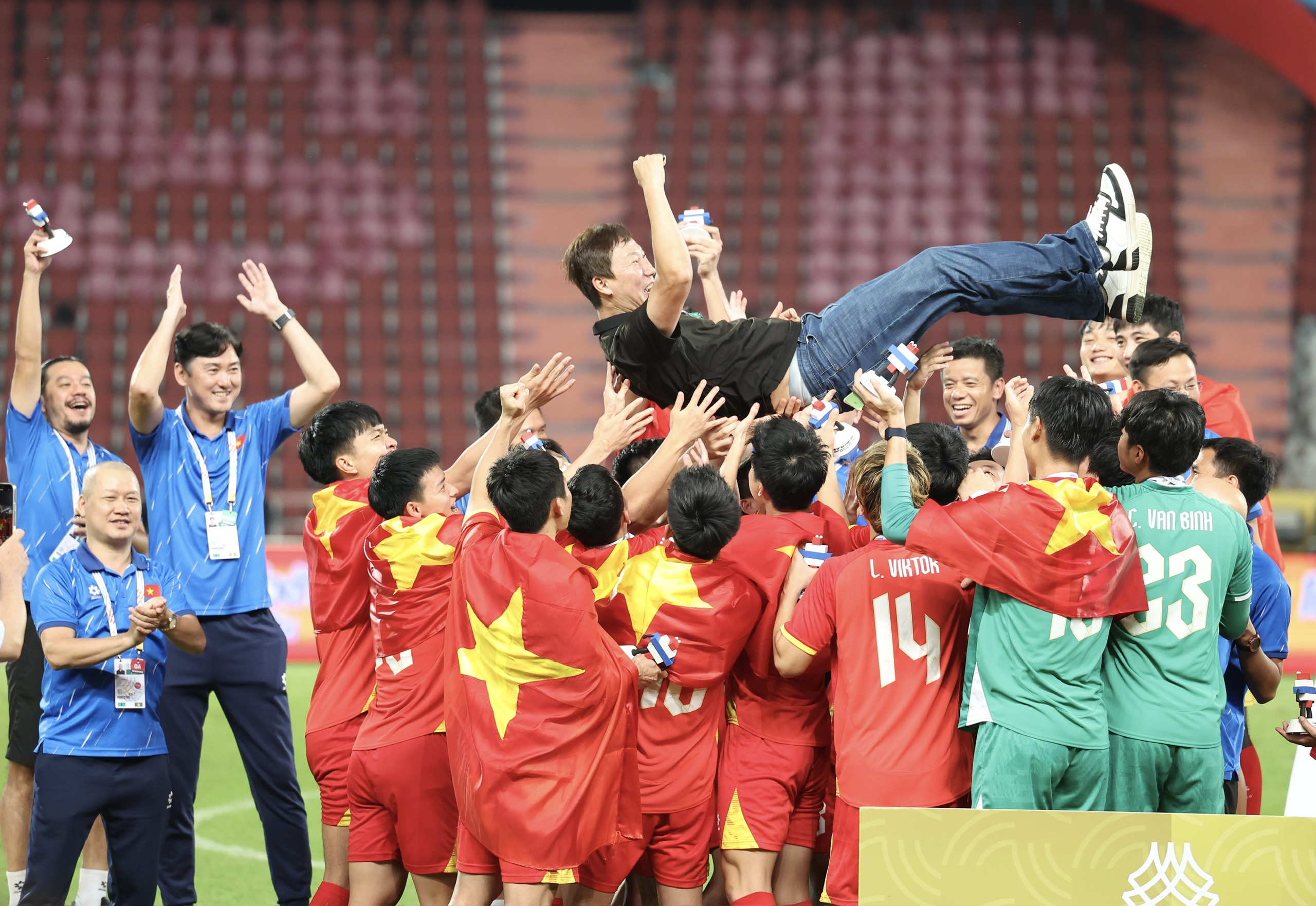 Các tuyển thủ U22 Việt Nam tung hô HLV Kim Sang-sik sau khi giành huy chương vàng SEA Games 33. ẢNH: DŨNG PHƯƠNG