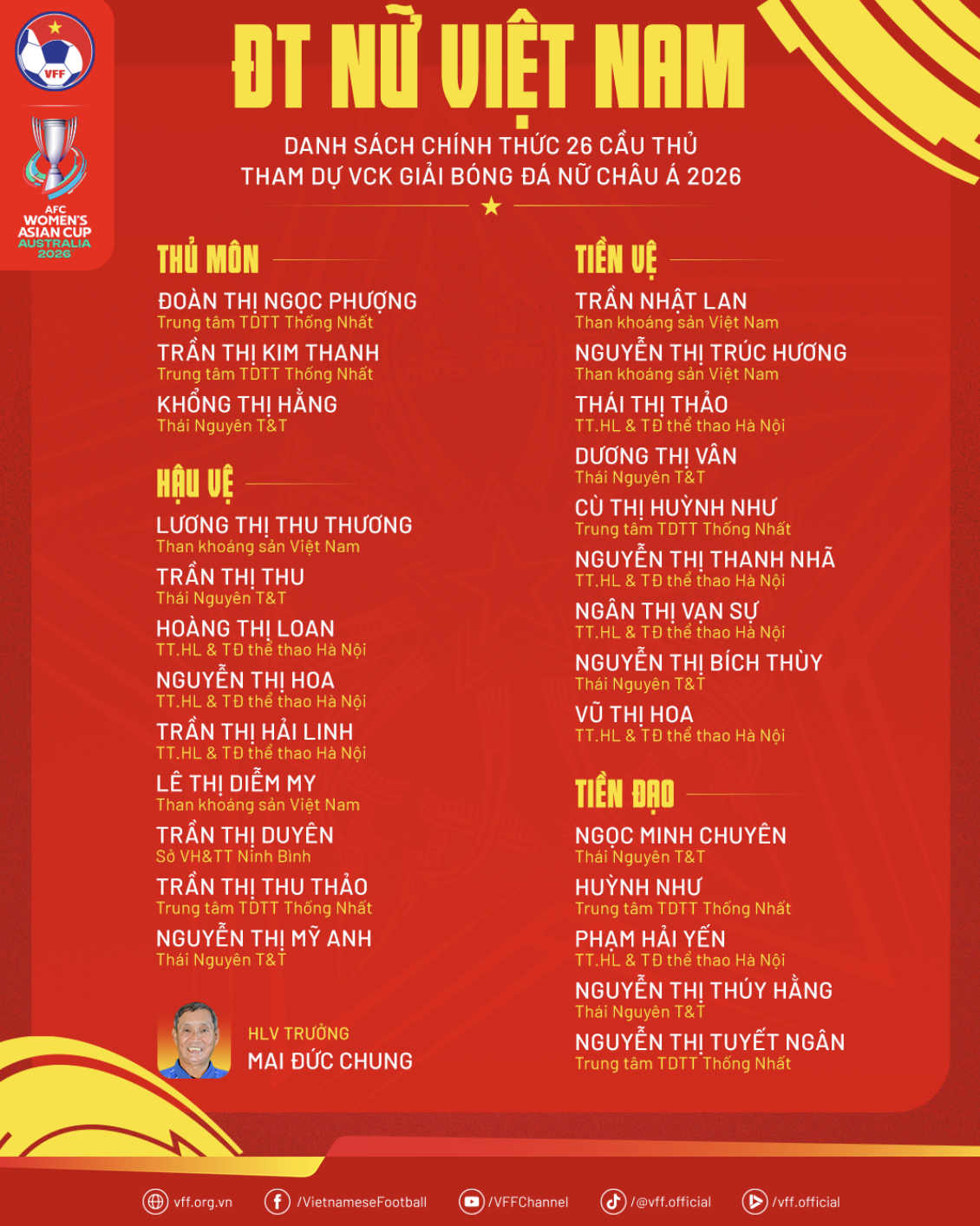 Trước ngày lên đường sang Australia tham dự Vòng chung kết Giải bóng đá nữ châu Á 2026, HLV Mai Đức Chung cho biết toàn đội đang có sự chuẩn bị tốt nhất cả về chuyên môn lẫn thể trạng, hướng tới mục tiêu thi đấu hết mình vì màu cờ sắc áo.