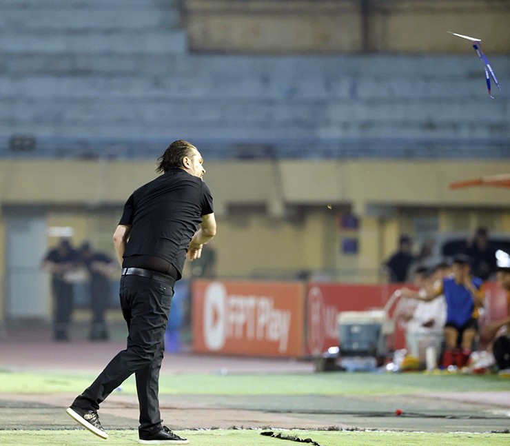 Tuy nhiên, sau khi nhận án phạt từ "vua áo đen", thay vì kiềm chế cảm xúc, nhà cầm quân này lại tiếp tục tái phạm, thể hiện một thái độ vô cùng quá khích. Đỉnh điểm của sự việc là khoảnh khắc ông phẫn nộ lột thẻ làm nhiệm vụ (bảng tên) ném thẳng xuống sân Hàng Đẫy trước khi đi vào khu kỹ thuật đội nhà.