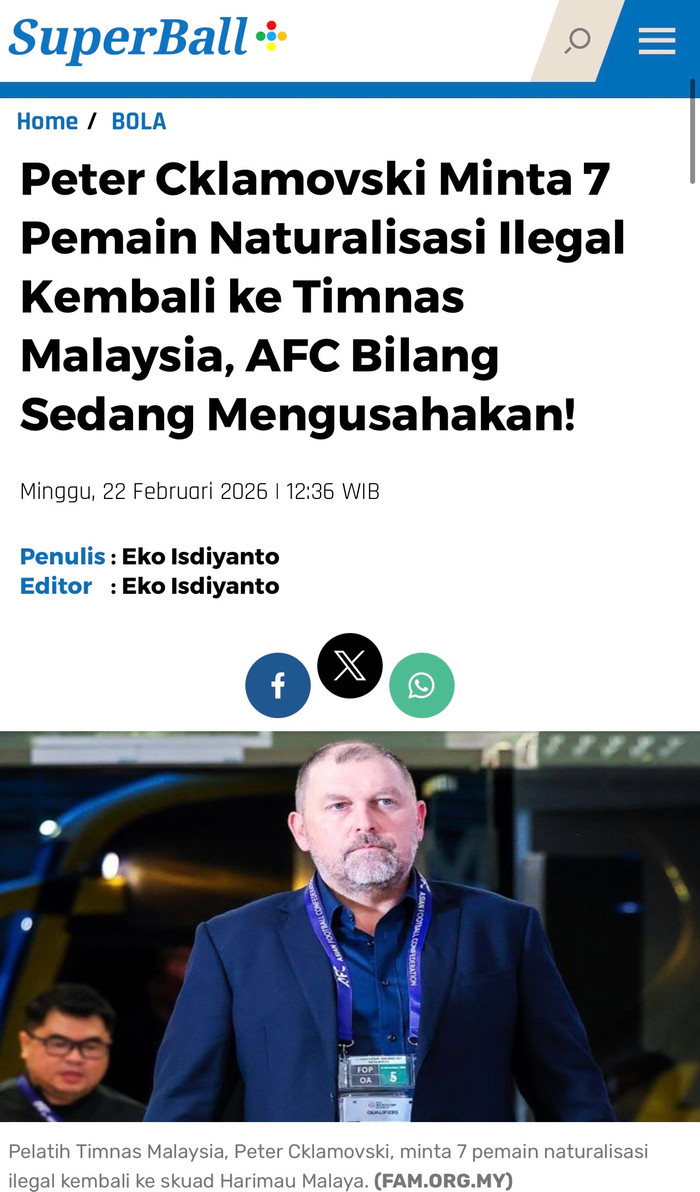 “HLV Peter Cklamovski đề nghị 7 cầu thủ nhập tịch “bị xem là không hợp lệ” trở lại tuyển Malaysia, AFC cho biết đang tìm cách giải quyết”, tờ Superball của Indonesia viết.