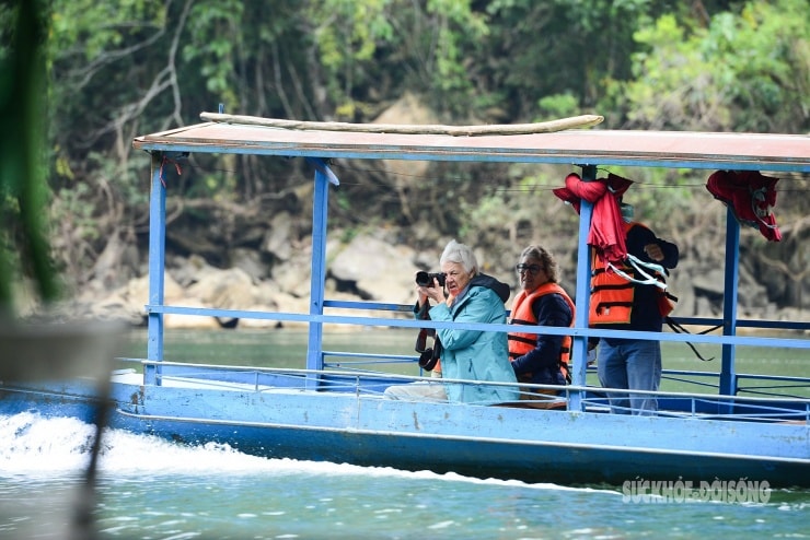 Du khách quốc tế ngắm cảnh khi thuyền xuôi nhẹ giữa lòng hồ Ba Bể trong buổi sáng se lạnh.
