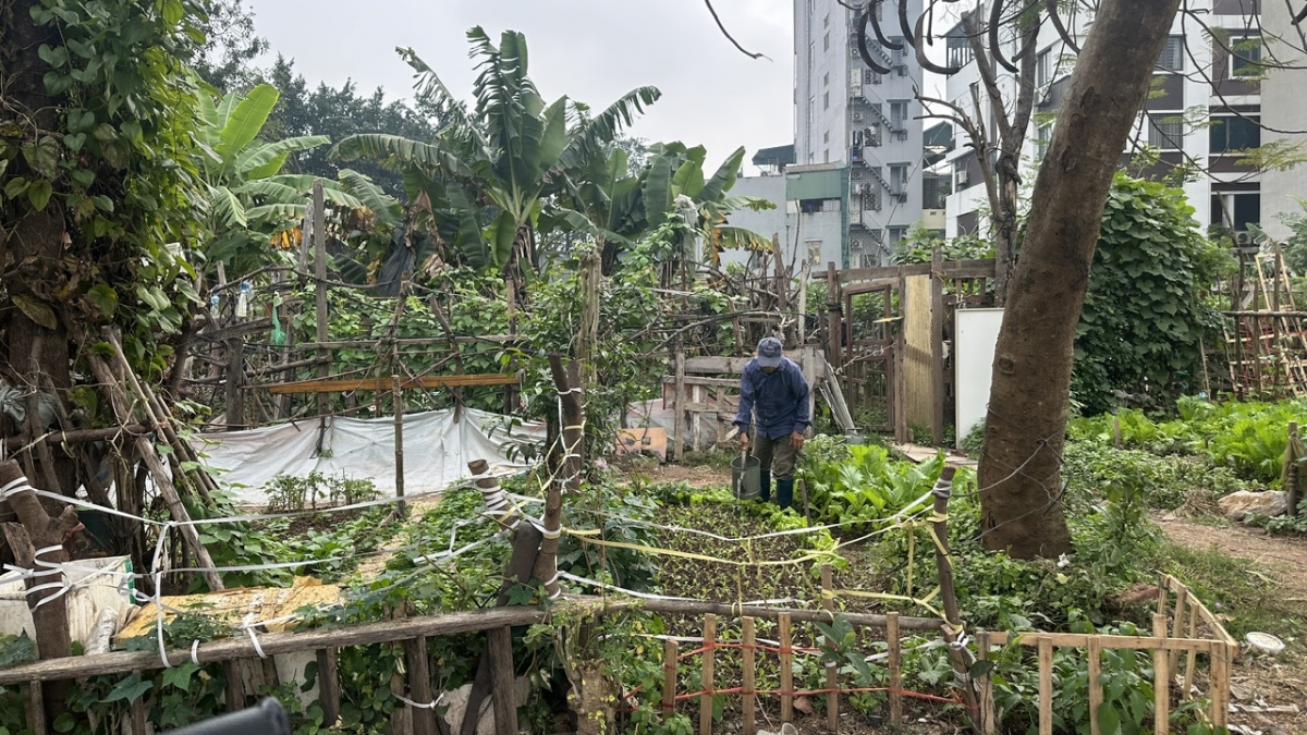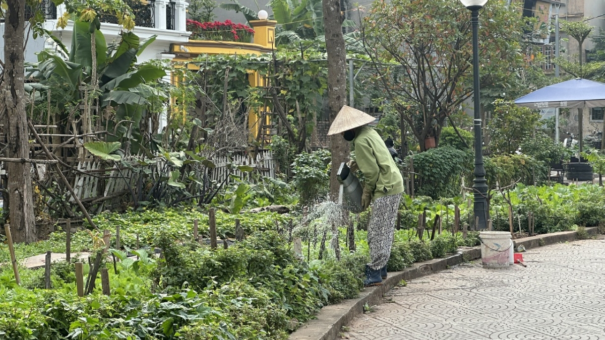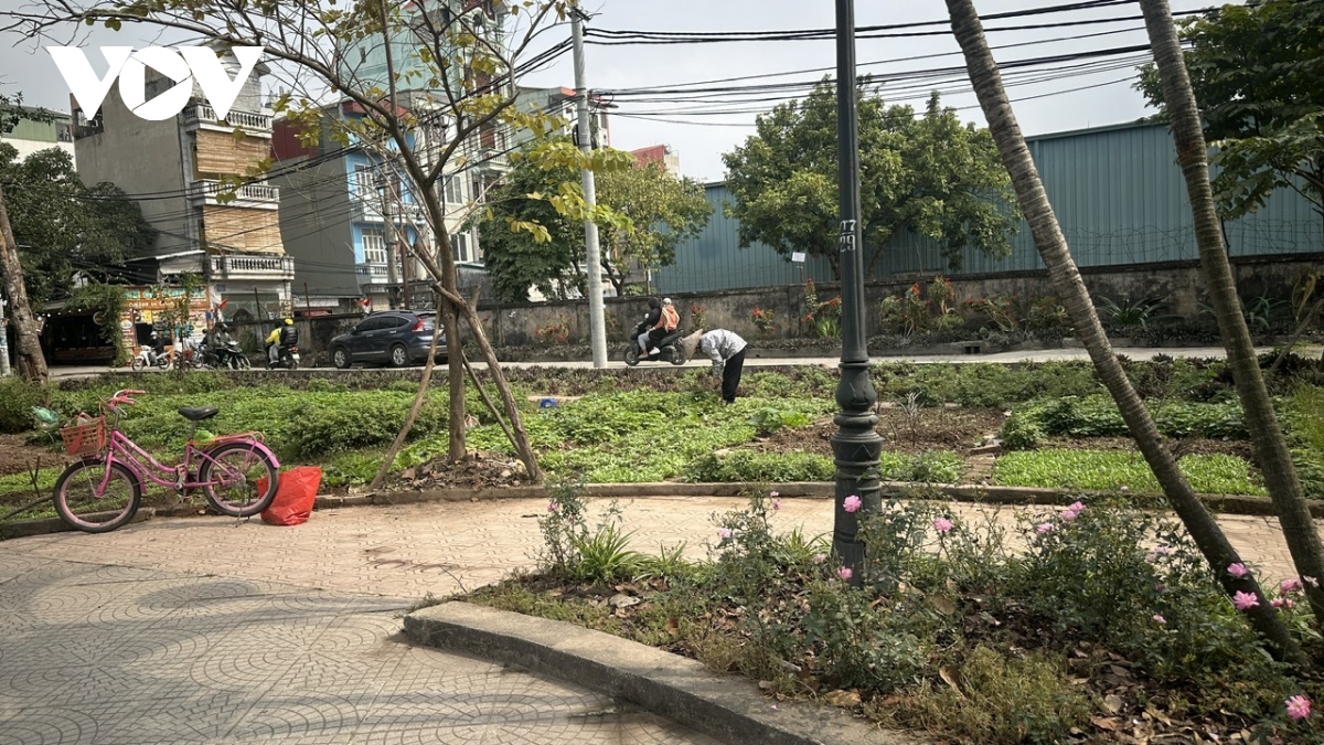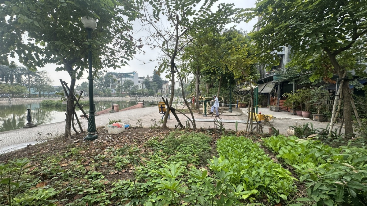 Những vạt đất sát đường dạo quanh hồ không gian công cộng, dành cho người dân đi bộ là những mảnh vườn trồng rau. Những luống cây được chia hàng, cắm cọc và căng dây chiếm sát mép đường.