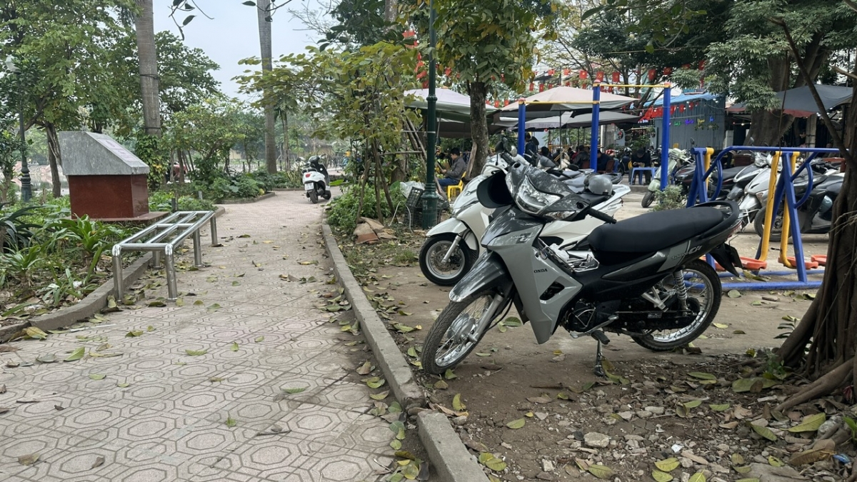 Khu vực bố trí dụng cụ để người dân tập thể dục thường xuyên bị biến thành nơi để xe, bày bàn ghế để kinh doanh.
