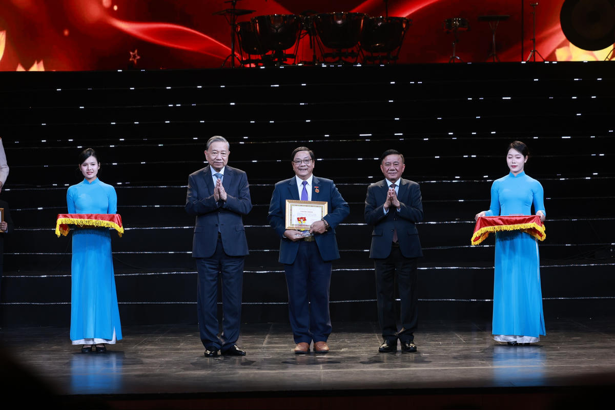 Tổng Bí thư Tô Lâm và Thường trực Ban Bí thư Trần Cẩm Tú trao Giấy chứng nhận và Biểu trưng cho các cá nhân, tập thể điển hình tiêu biểu toàn quốc trong học tập và làm theo tư tưởng, đạo đức, phong cách Hồ Chí Minh năm 2025. Ảnh Như Ý