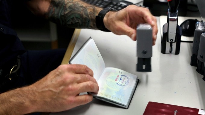 Nhân viên xuất nhập cảnh đang đóng dấu vào hộ chiếu cho du khách.