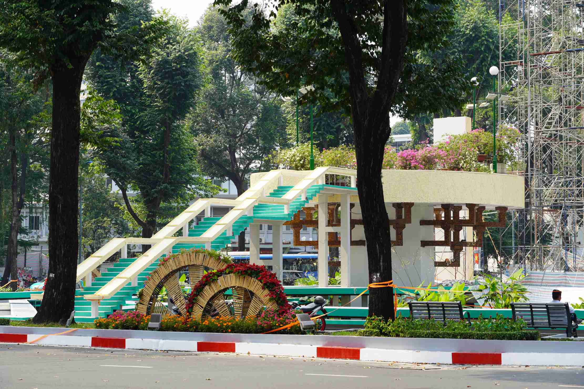 Dưới hồ, các tiểu cảnh thuyền hoa được bố trí theo cụm, tạo hình những chiếc xuồng chở đầy hoa tươi, mang không khí sông nước Nam Bộ. Ảnh: Nguyên Phong