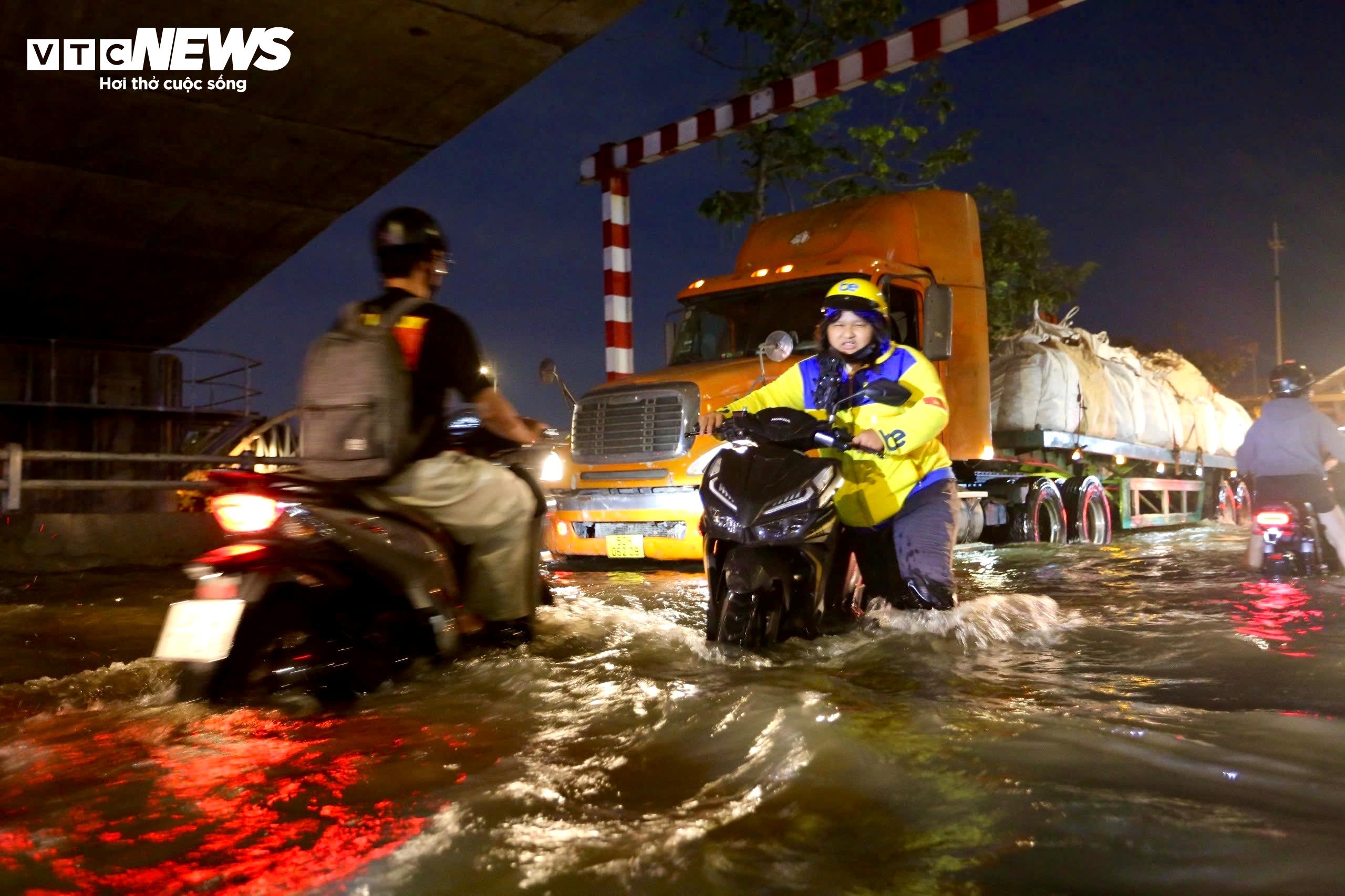 Triều cường gây ngập trên đường Trần Xuân Soạn (phường Tân Thuận, TP.HCM) vào tối 22/10.