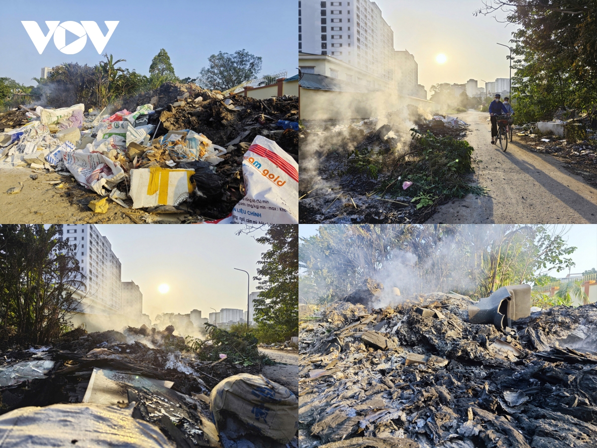 Nghiêm trọng hơn, khu vực xung quanh hồ điều hòa còn trở thành bãi rác tự phát. Người dân xả rác bừa bãi, rác thải xuất hiện ở nhiều vị trí. Khi phóng viên có mặt, một số đống rác đã được đốt, khói bay mù mịt, ảnh hưởng trực tiếp đến người đi đường và các hộ dân xung quanh.