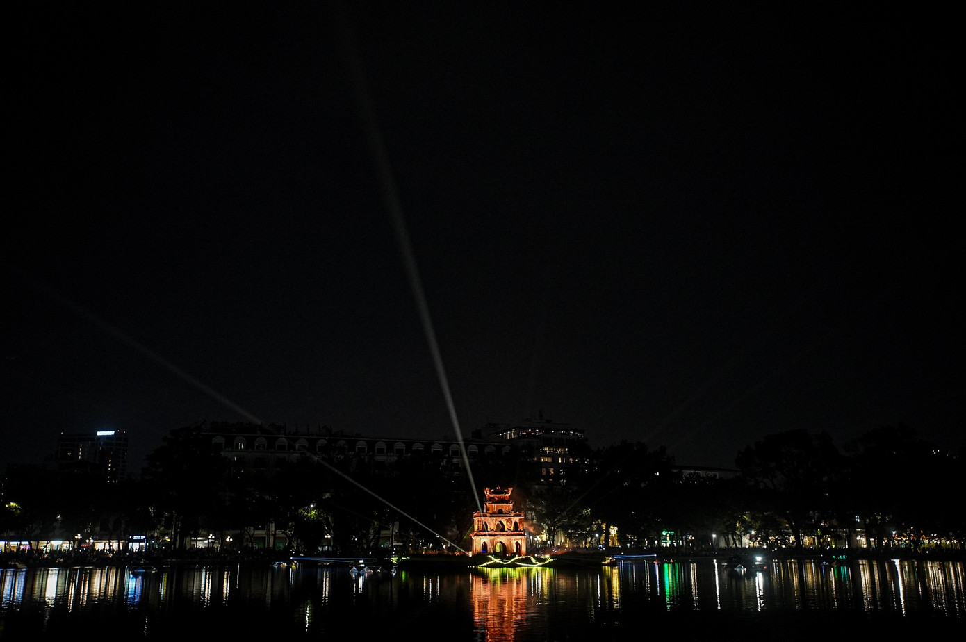 Hồ Gươm trở nên huyền ảo với các gam màu ánh sáng.