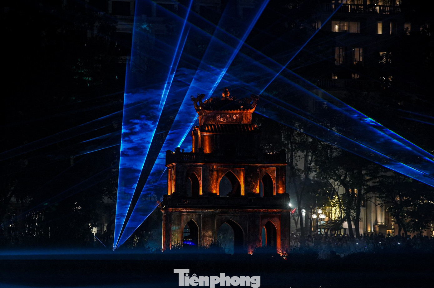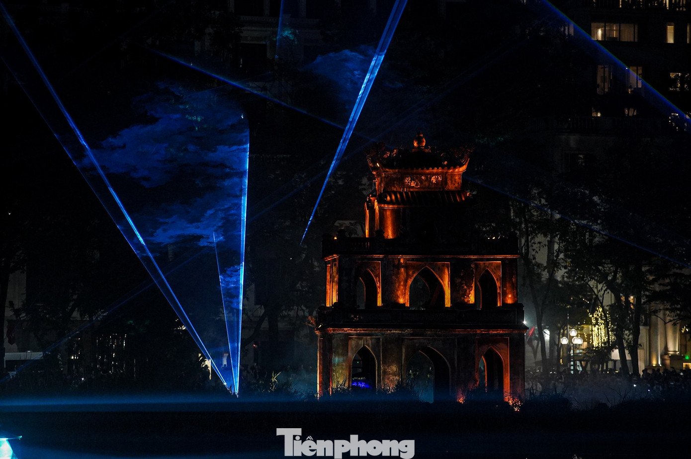 Tháp Rùa trở thành điểm nhấn thị giác trong màn chiếu sáng nghệ thuật.