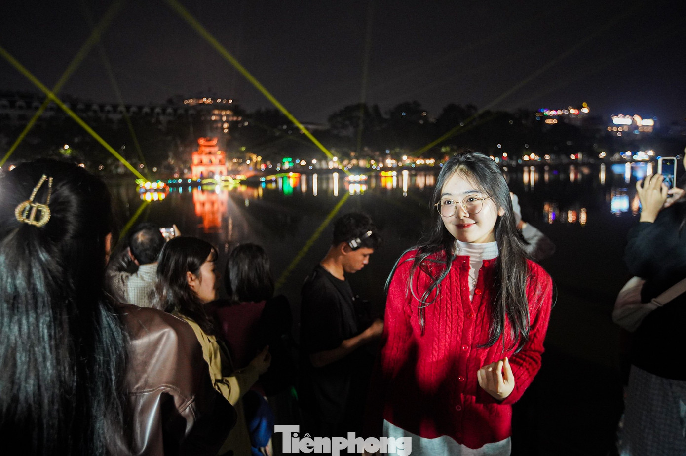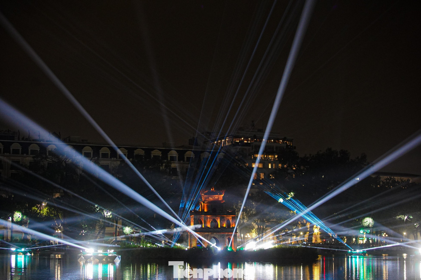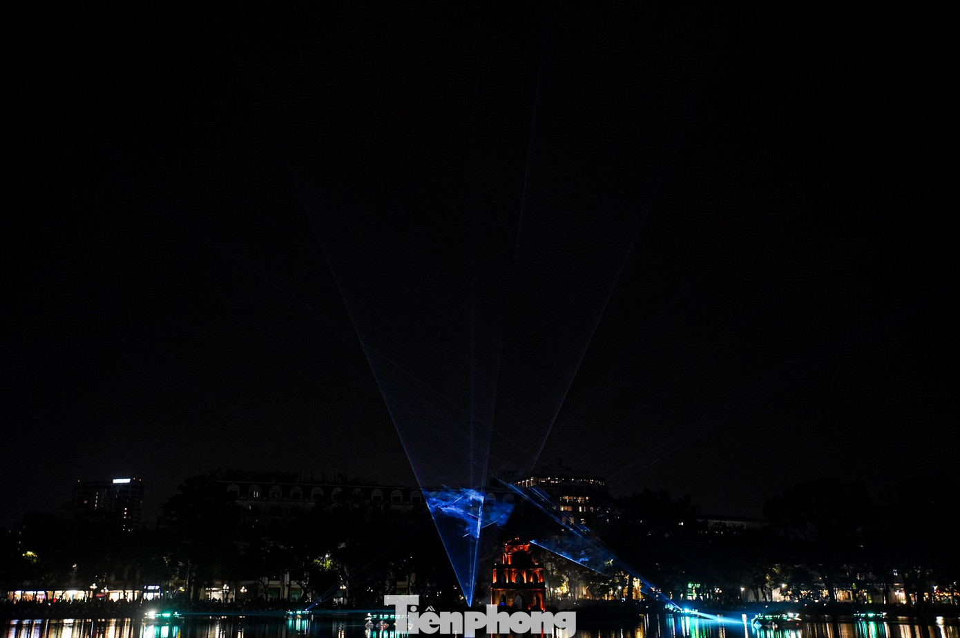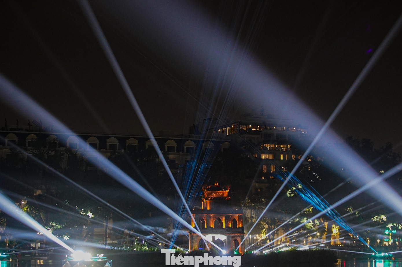 Rất đông người dân và du khách đến sớm, tập trung xung quanh hồ Hoàn Kiếm để chờ đón màn trình diễn chiếu sáng nghệ thuật này.