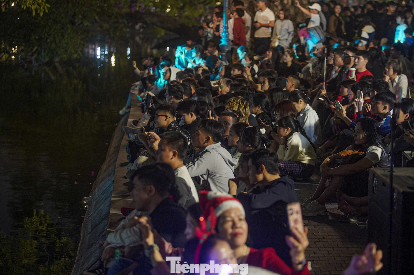 Người dân và du khách ngồi chật cứng hai bên bờ kè để tận hưởng bữa tiệc ánh sáng.