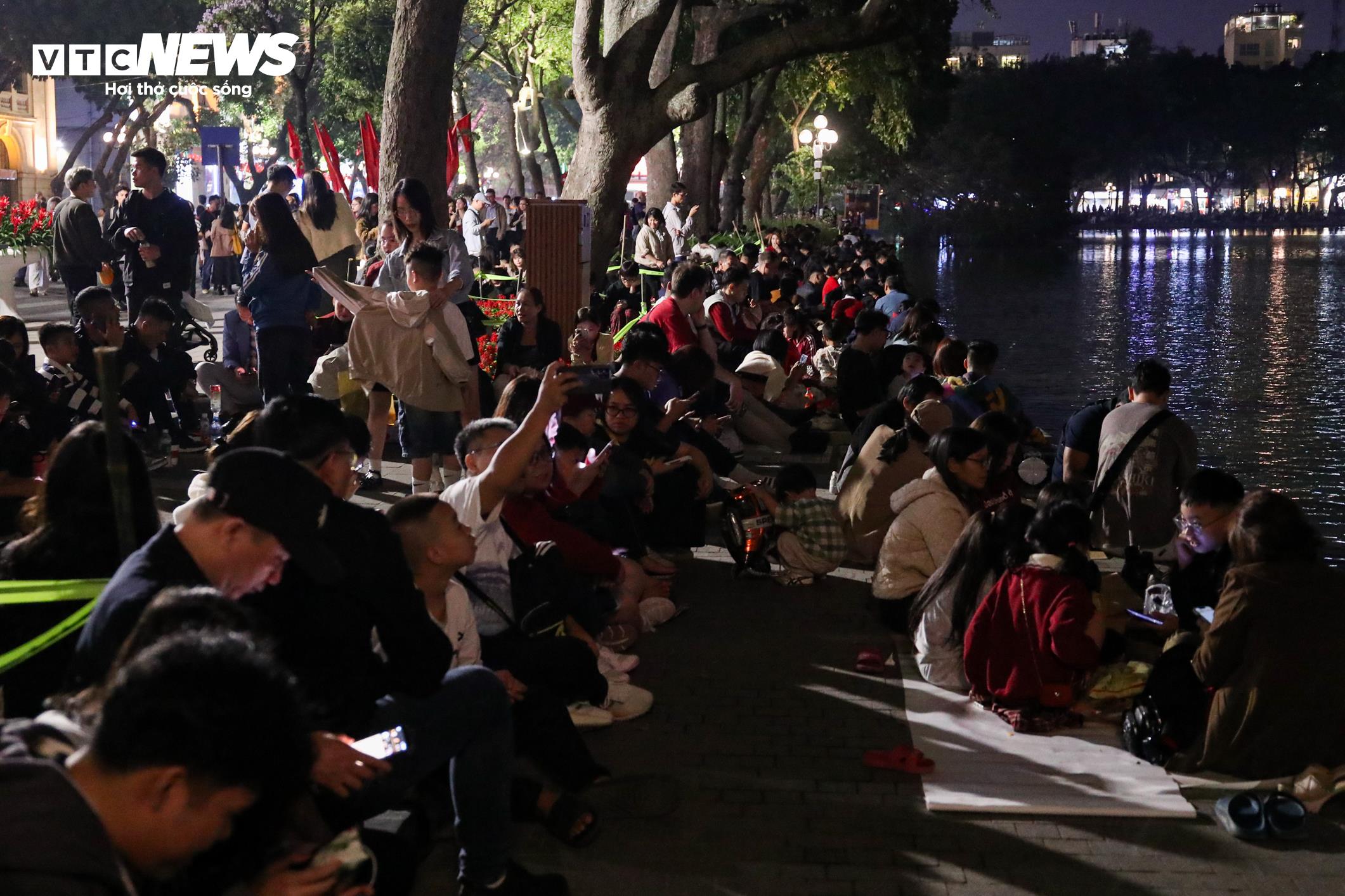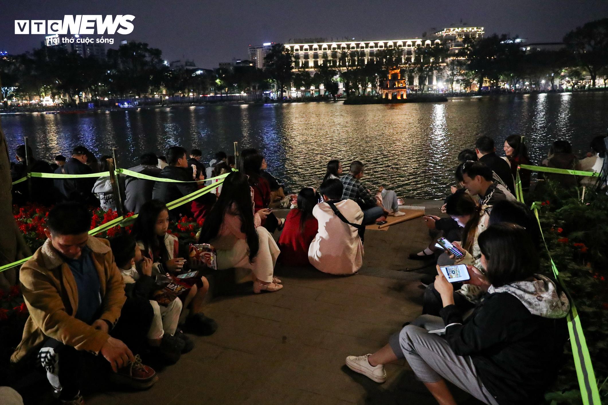 Dù còn gần 2 tiếng nữa mới đến thời khắc chuyển giao năm mới, bờ hồ đã chật kín người trải chiếu, lót giấy ngồi giữ chỗ.