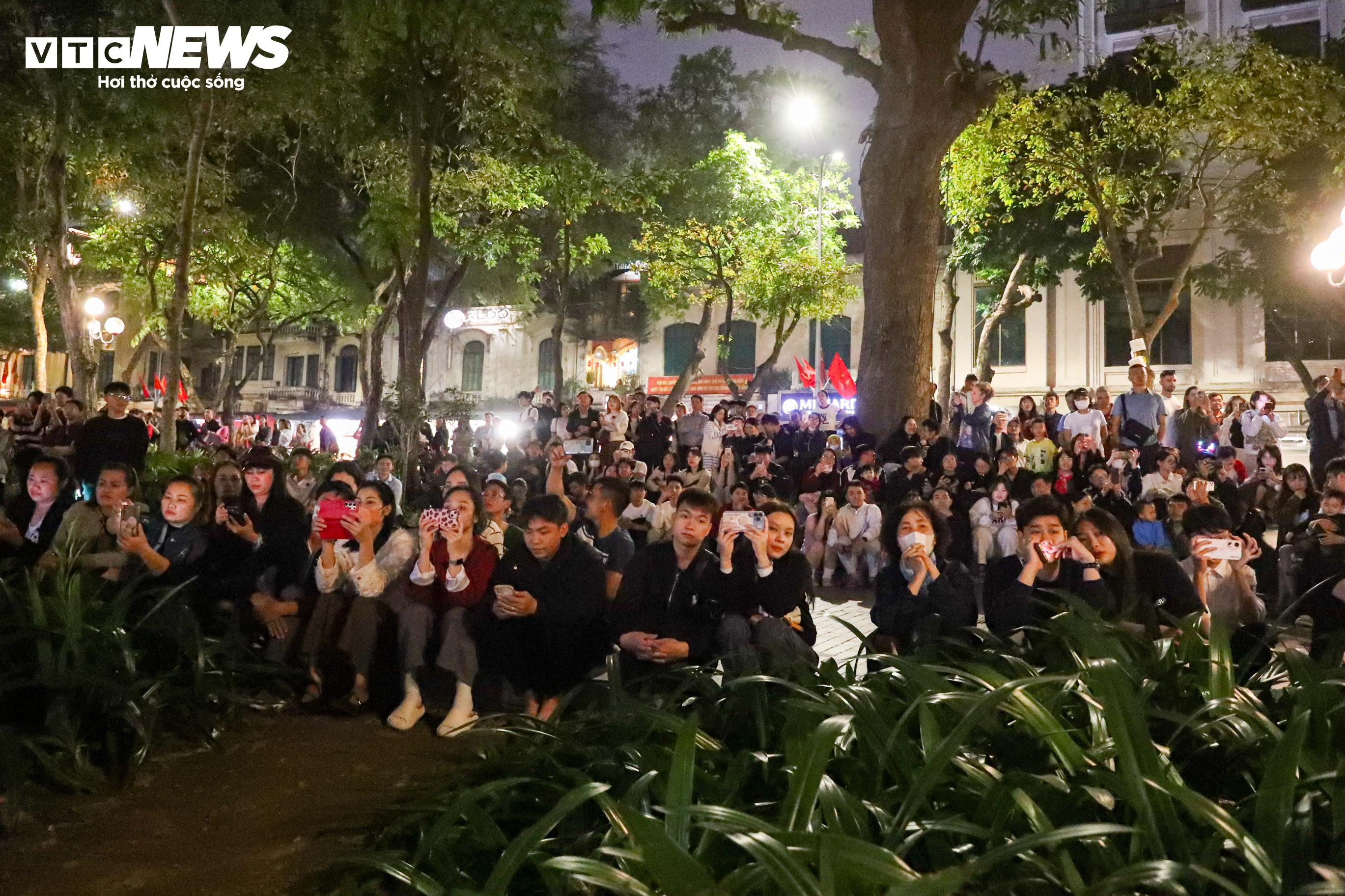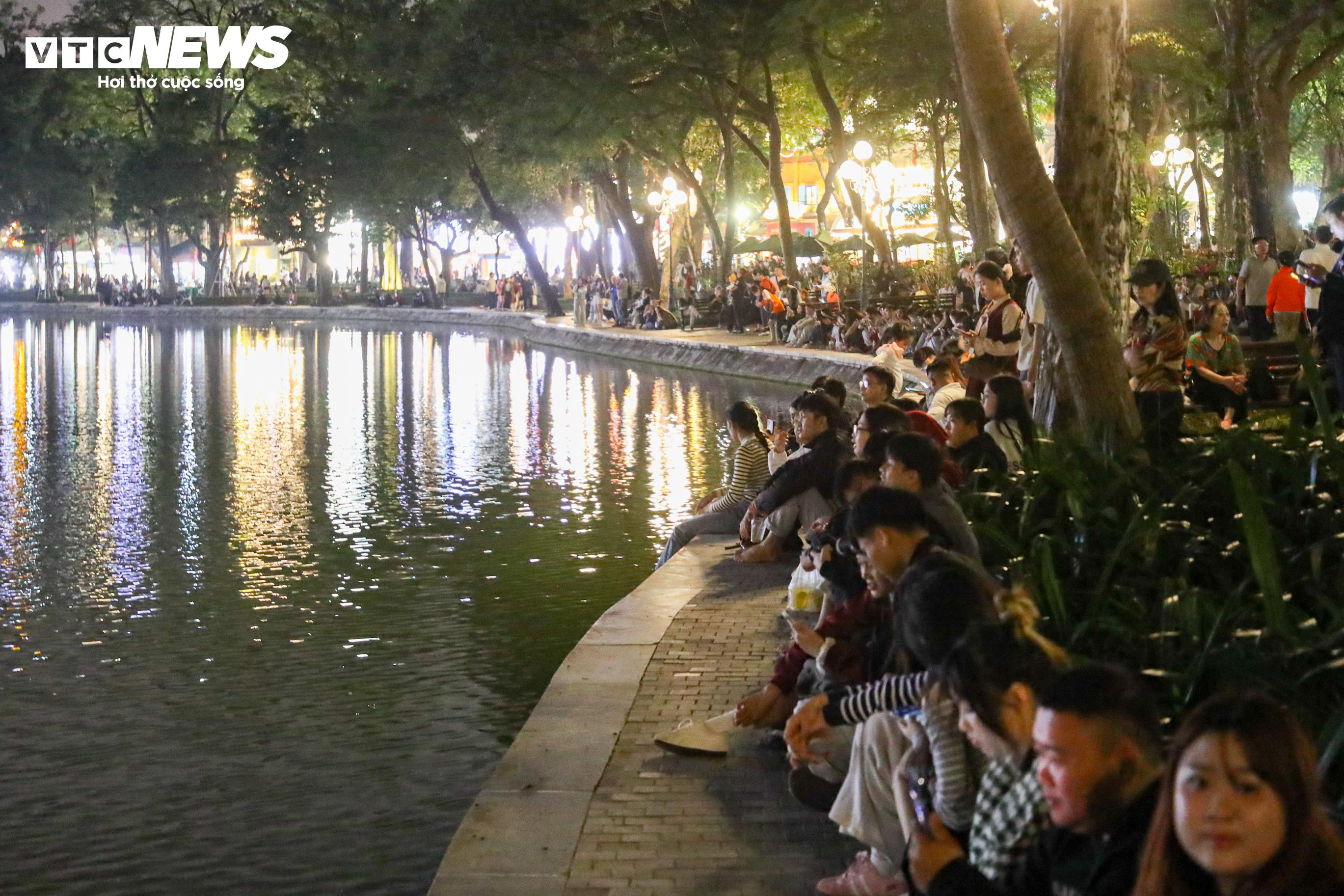 Người dân tập trung rất đông quanh khu vực Hồ Gươm, chờ đón màn trình diễn chiếu sáng nghệ thuật.