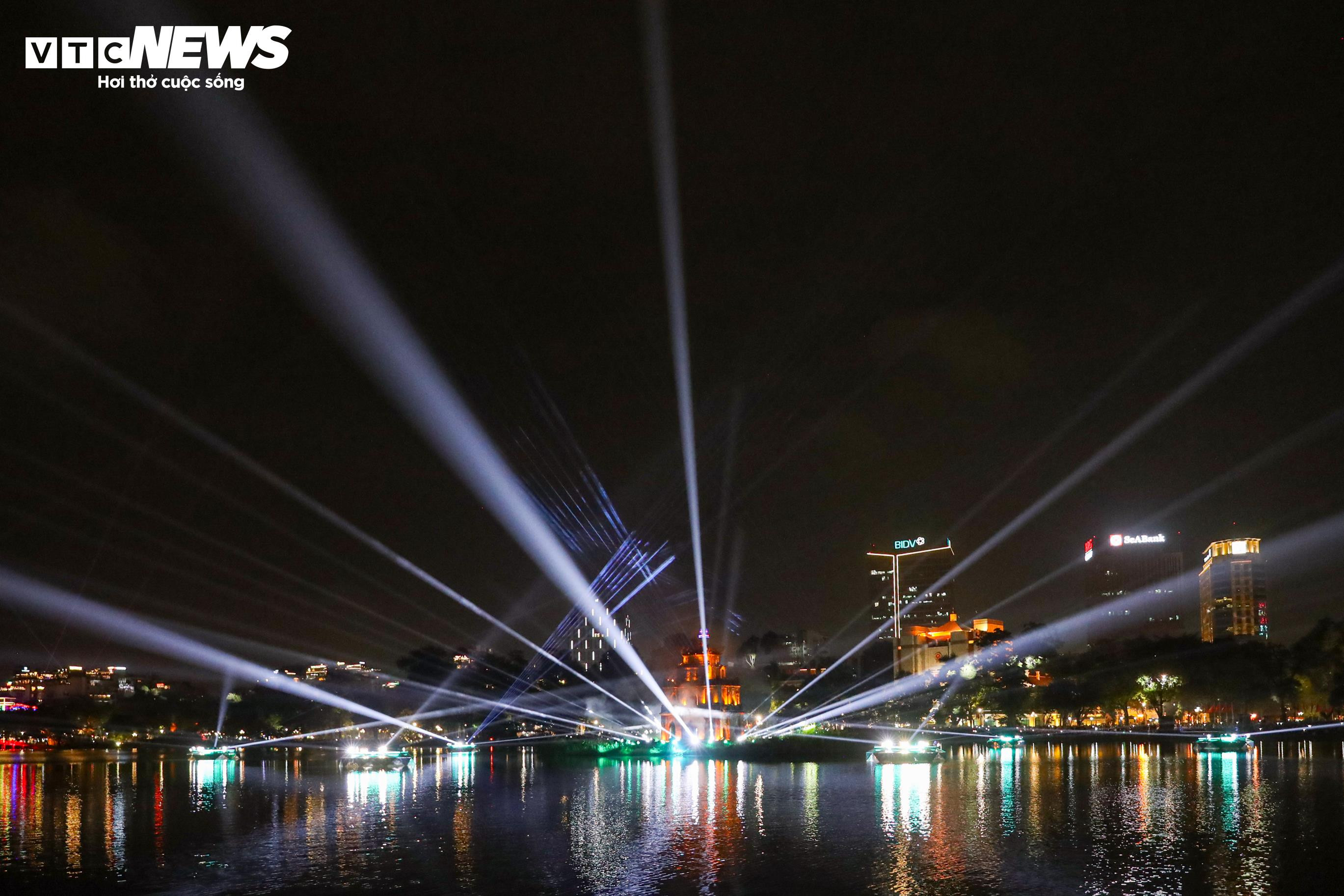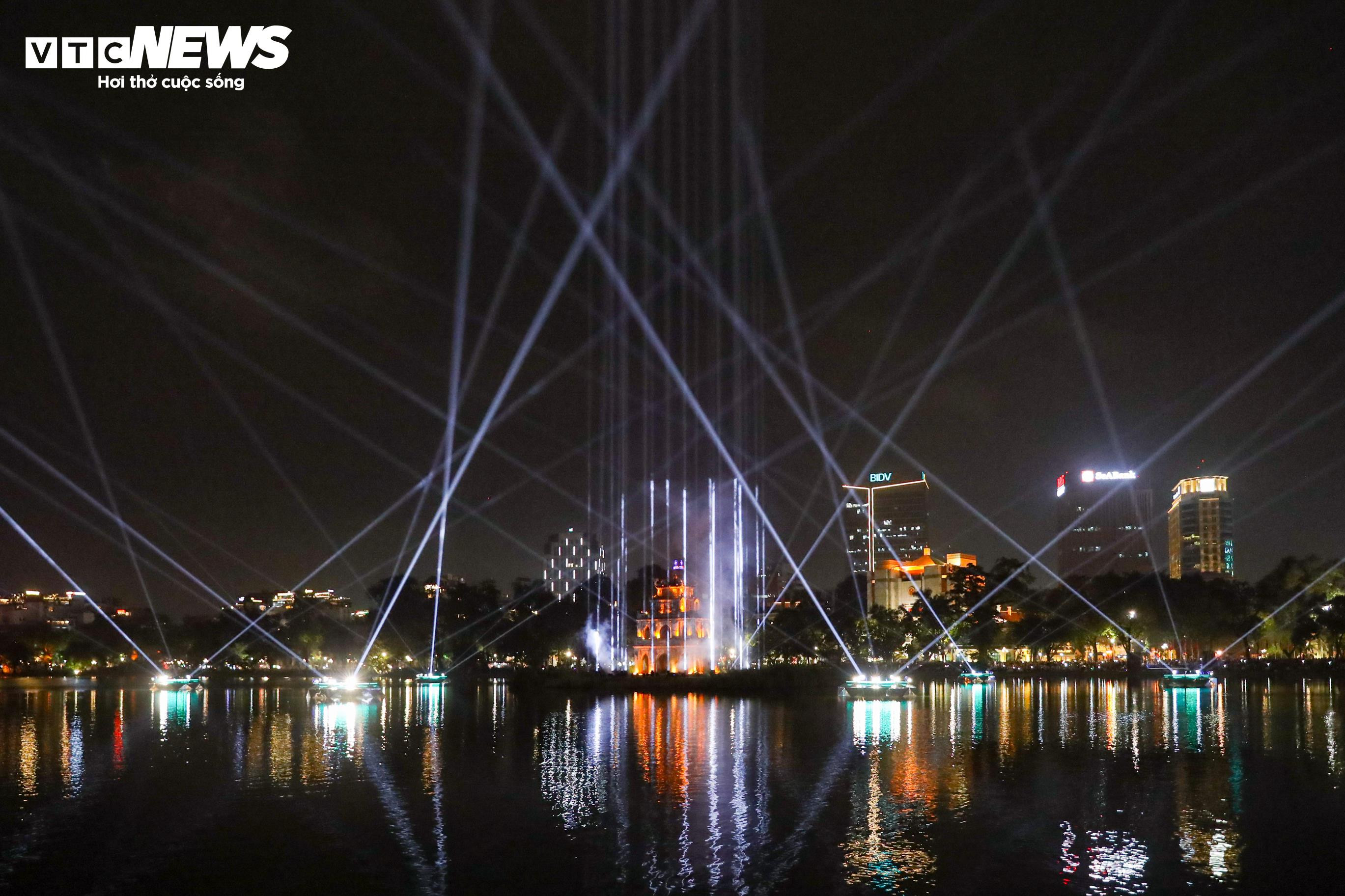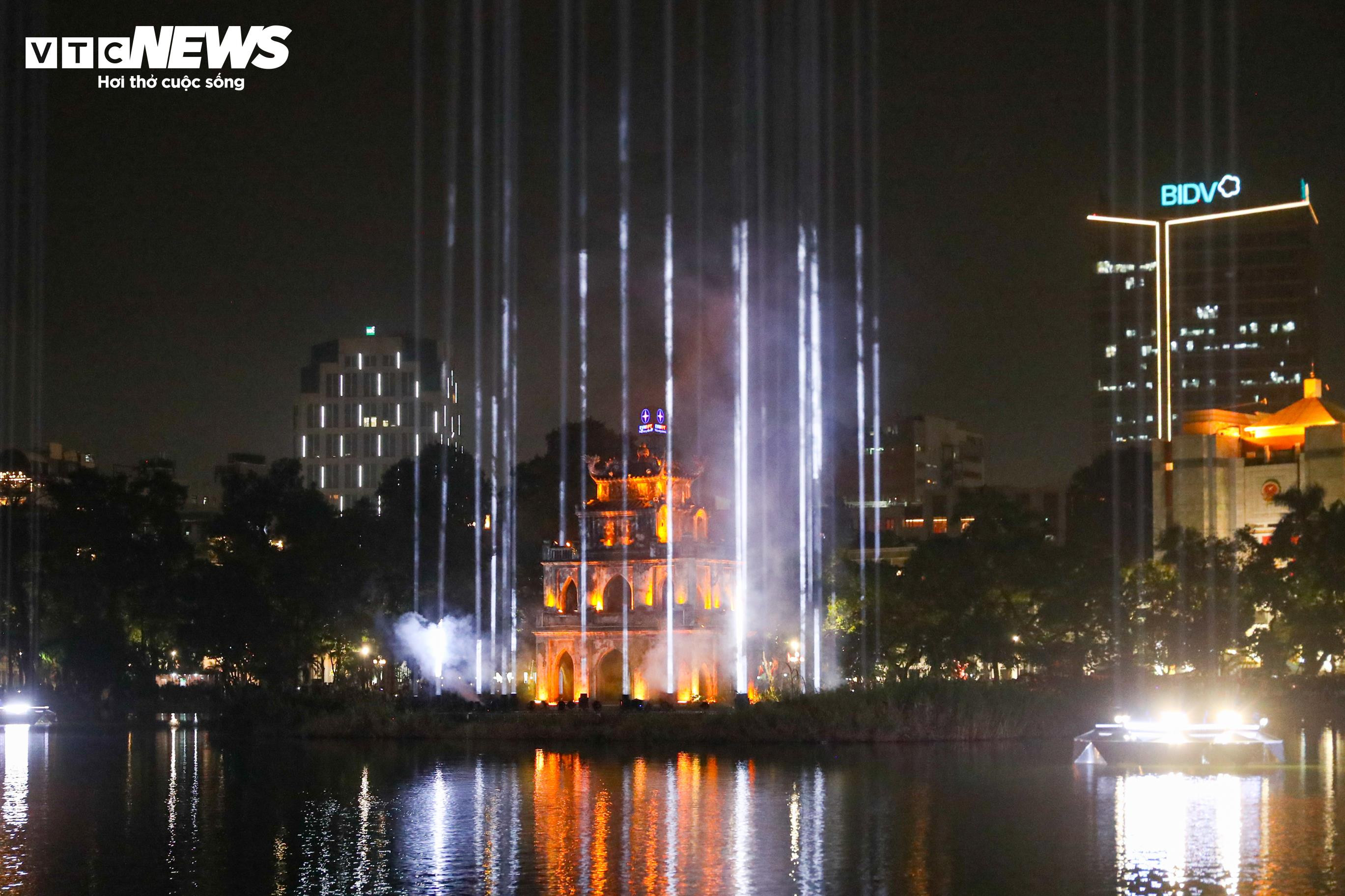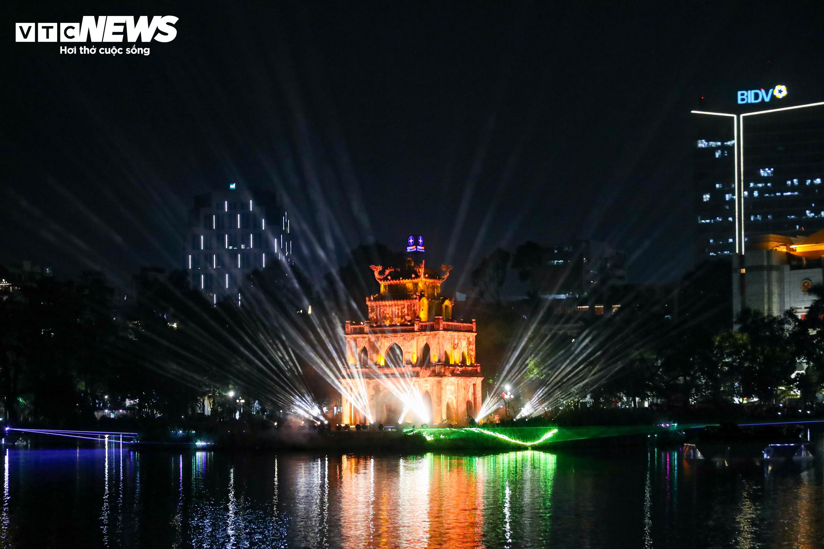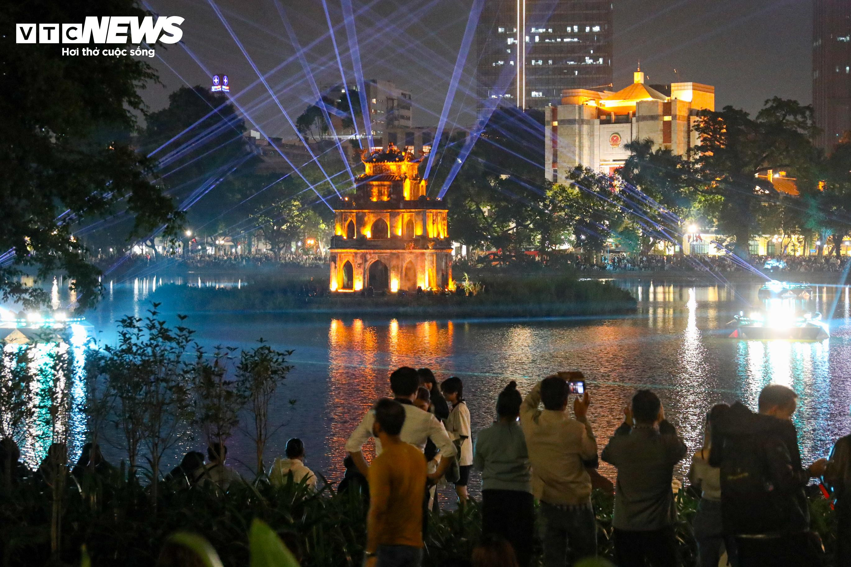 Đúng 20h, các cụm ánh sáng đa sắc được kích hoạt quanh Hồ Gươm, lấy tháp Rùa làm trung tâm; đông đảo người dân, du khách dùng điện thoại ghi lại khoảnh khắc.