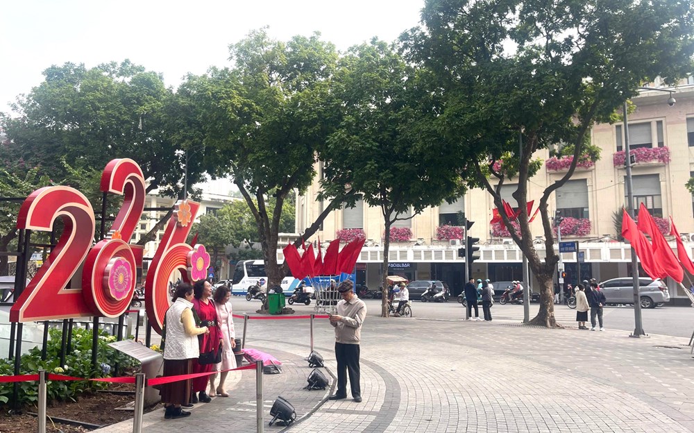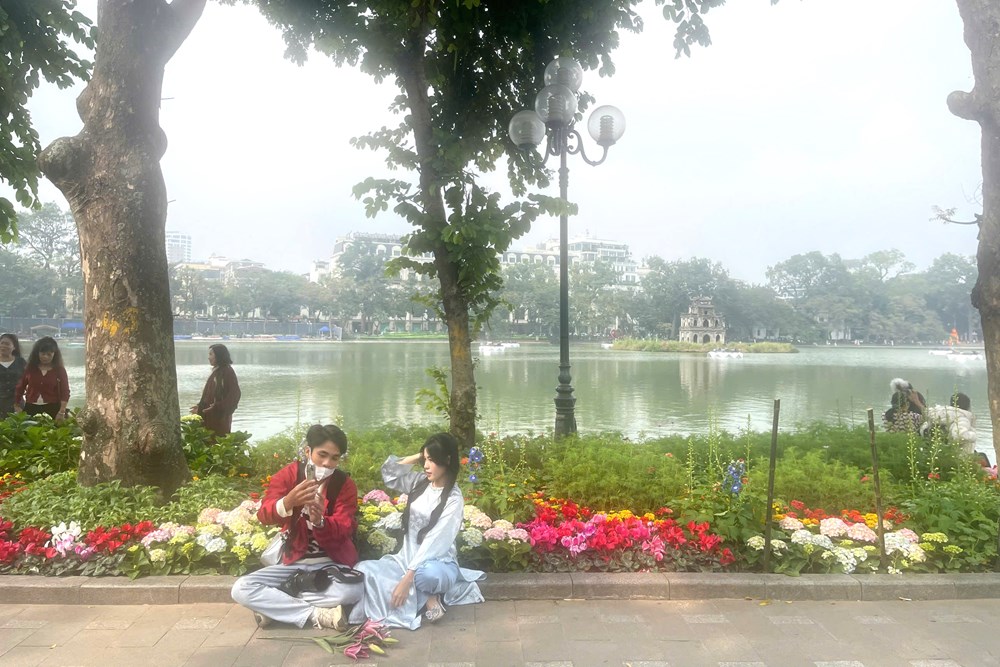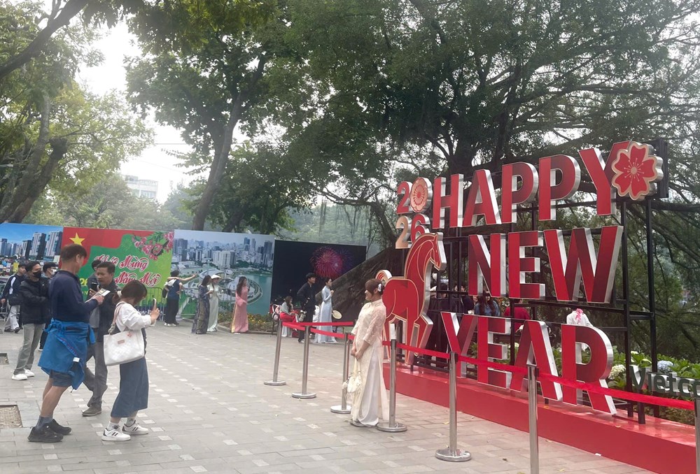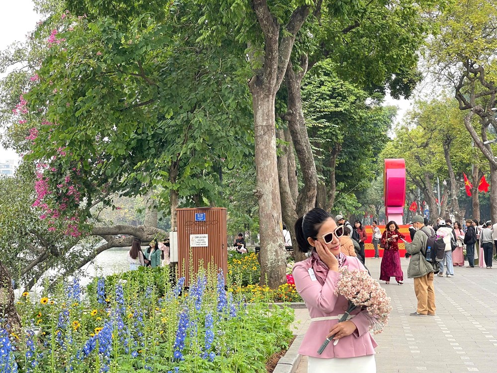 Trong không khí vui tươi của năm mới 2026, chỉ cần dạo bộ một vòng quanh hồ cũng đủ cảm nhận được không khí Tết. Những chiếc máy ảnh, điện thoại được giơ lên hoạt động liên tục để ghi lại khoảnh khắc mọi người tươi cười bên khóm hoa, bên những tiểu cảnh trang trí, phía sau là khung cảnh tháp Rùa in bóng thâm trầm trên mặt nước.